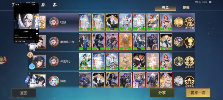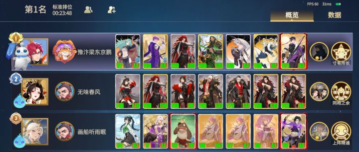 终于宗师了,算是勉强摸到高手门槛了吧期间停留最长的是钻石分段,当时不怎么会玩,基本每把都是第3第4,一把老8一天白玩。后面会玩了之后上分反而简单了不少。以下记录了最近20把的数据:平均名次2,登顶率50%,前四率95%(名次-统帅-阵容-谋略)1-曹植-后勤魏-魏征兵2-关羽-后勤蜀-先机精通1-项羽-跳操唐-遗计精通2-孙武-双龙会-寸有所长2-敖广-烟花蜀-上阵精通1-李靖-