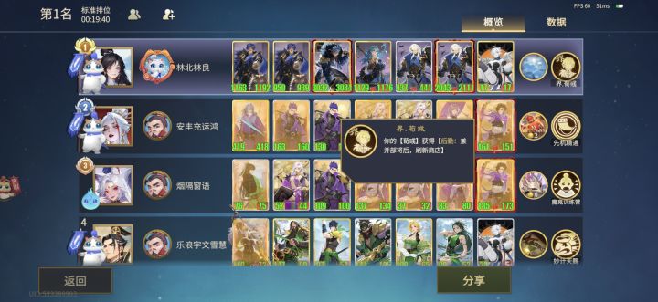终于宗师了,算是勉强摸到高手门槛了吧期间停留最长的是钻石分段,当时不怎么会玩,基本每把都是第3第4,一把老8一天白玩。后面会玩了之后上分反而简单了不少。以下记录了最近20把的数据:平均名次2,登顶率50%,前四率95%(名次-统帅-阵容-谋略)1-曹植-后勤魏-魏征兵2-关羽-后勤蜀-先机精通1-项羽-跳操唐-遗计精通2-孙武-双龙会-寸有所长2-敖广-烟花蜀-上阵精通1-李靖-