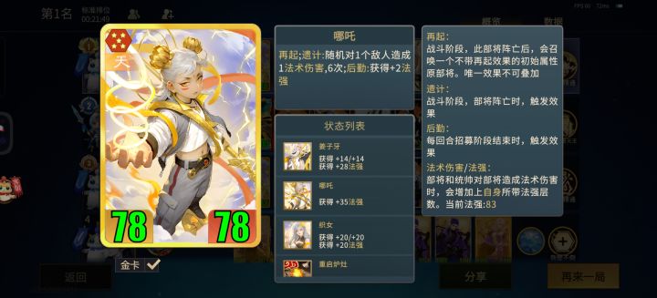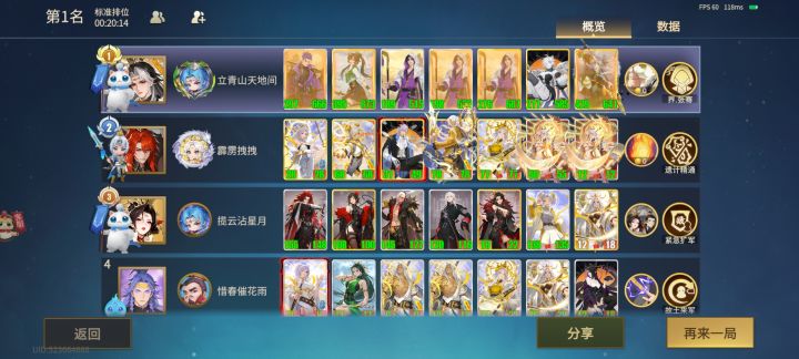 终于宗师了,算是勉强摸到高手门槛了吧期间停留最长的是钻石分段,当时不怎么会玩,基本每把都是第3第4,一把老8一天白玩。后面会玩了之后上分反而简单了不少。以下记录了最近20把的数据:平均名次2,登顶率50%,前四率95%(名次-统帅-阵容-谋略)1-曹植-后勤魏-魏征兵2-关羽-后勤蜀-先机精通1-项羽-跳操唐-遗计精通2-孙武-双龙会-寸有所长2-敖广-烟花蜀-上阵精通1-李靖-