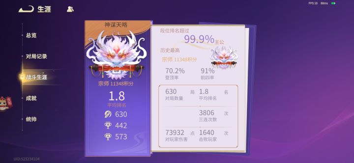 终于宗师了,算是勉强摸到高手门槛了吧期间停留最长的是钻石分段,当时不怎么会玩,基本每把都是第3第4,一把老8一天白玩。后面会玩了之后上分反而简单了不少。以下记录了最近20把的数据:平均名次2,登顶率50%,前四率95%(名次-统帅-阵容-谋略)1-曹植-后勤魏-魏征兵2-关羽-后勤蜀-先机精通1-项羽-跳操唐-遗计精通2-孙武-双龙会-寸有所长2-敖广-烟花蜀-上阵精通1-李靖-