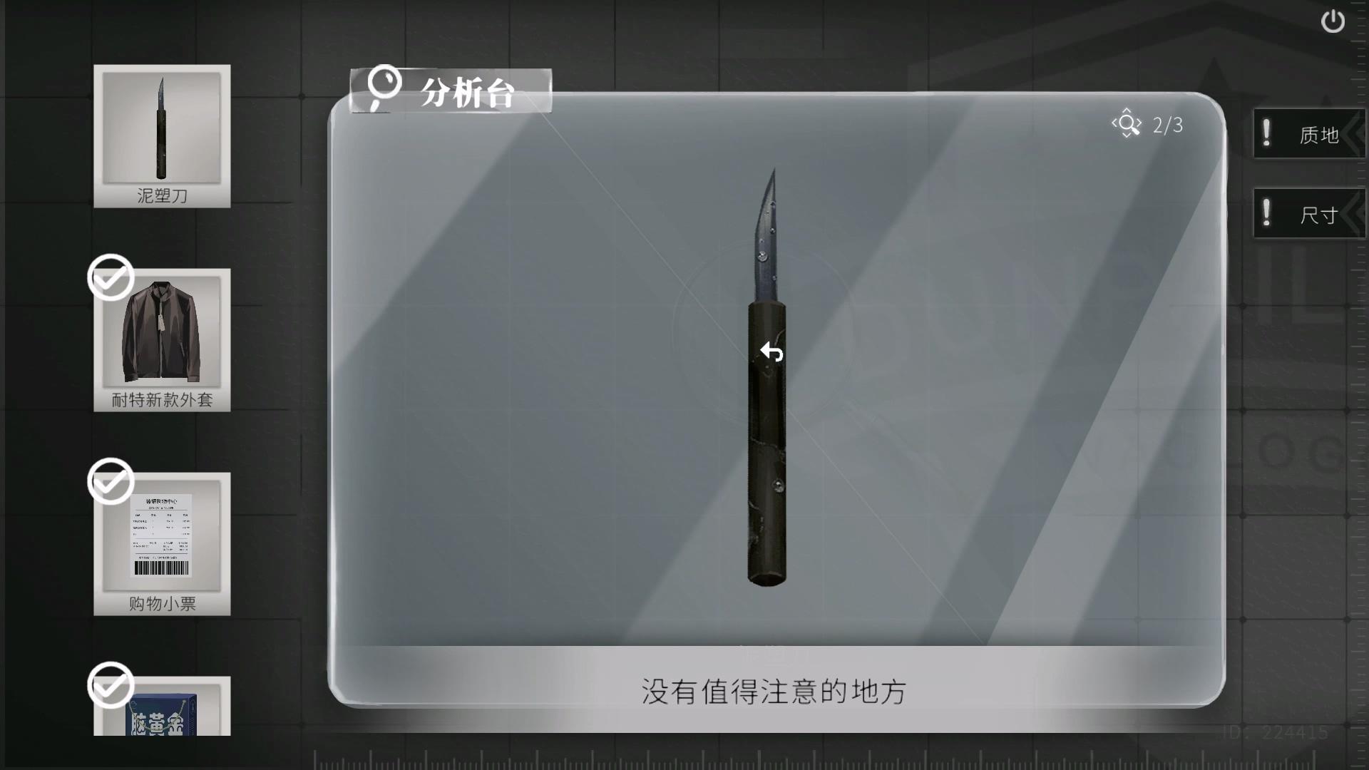 游戏的玩法非常的简单,玩家将扮演新人警察小程,和自己的搭档苏警官一起探案,不过在游戏中苏警官主要是提示作用,案件的信息收集、推理和总结都需要玩家独立完成。游戏主要是使用wasd控制行动,按键e和鼠标左键用来调查,q可以进入道具界面,可以用来使用道具和案件簿和检查台,案件簿会记录按键的各种信息,包括通过收集的信息找到的新信息都会记录在内,检查台则是会对关键证物进行全面的检查,找到上面的关键信息,找到后信息会补充到案件簿内。除此之外,本作还增加了观察了要素,可以用来观察案件的人或物,看到不对劲的地方就可以进行调查,调查后的信息会补充到案件簿。