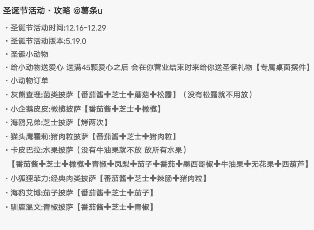 圣诞节活动挑战· 游戏日挑战:每完成3个游戏日提升1等级解锁15等级需要完成45个游戏日. 给小动物送爱心:每送出24个爱心提升1等级解锁15等级需要送出360个爱心. 每日挑战:每完成5个挑战提升1等级解锁15等级需要完成60个游戏日. 完成所有任务可得:雪橇铃铛墙纸+节日树披萨盒+冬季围巾派得壳+1950披萨币+60砖石. 也可用砖石完成任务解锁全部需450砖石. #可口的披萨美味的披萨