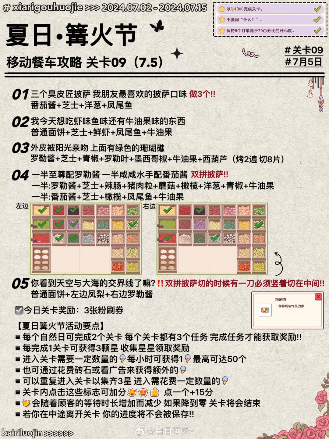 Day14移动餐车攻略 7.5 夏日篝火节完美收官👏👏 1⃣健康又营养的披萨(素食+鸡肉+牛油果) 番茄酱+芝士+蘑菇+茄子+橄榄+洋葱+青椒+罗勒叶+凤梨+玉米+大蒜+番茄+墨西哥椒+牛油果+鸡肉 2⃣最后一次挑战(烤2遍) 一半:罗勒酱+芝士+玉米+蘑菇一半:番茄酱+培根+猪肉粒+火腿 3⃣夏日篝火节最后一晚 罗勒酱+芝士+辣肠+猪肉粒+培根+火腿+牛油果 4⃣最后一单披萨(3份)【全麦面饼】 全麦面饼+番茄酱+芝士+辣肠+猪肉粒+培根+火腿+鲜虾+凤尾鱼+鸡肉+牛油果 这里别忘了用全麦面饼 今日餐车门槛:90个牛油果(5个含牛油果的披萨)最好多备点以防做错导致不够! 成功完成任务会获得灯牌一个,披萨盒一个