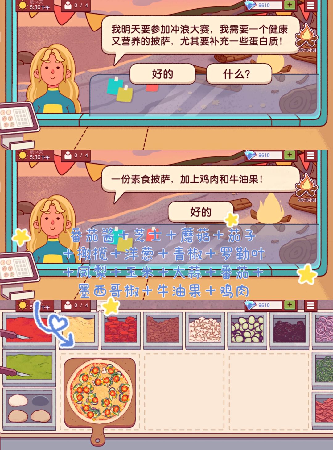⭕ 解题: 妮可的披萨是素食披萨(剧情提到了她喜欢植物, 同时也可以根据付款数推测), 蓝色指的是用蓝色披萨盒子(最开始我还以为蓝色指的是鱼🐟). ⭕ 注意: 在开启新的一天之前, 如果有机配料盒是空的, 顾客付的钱也会因此变动, 所以原则就是, 芝士酱料放上, 然后当天有什么素食材料就加什么, 不要漏. ⭕ 比如下图, 因为本店解锁了所有配料, 那么此时素食披萨卖29.4 加上所有非肉类食材,#美食