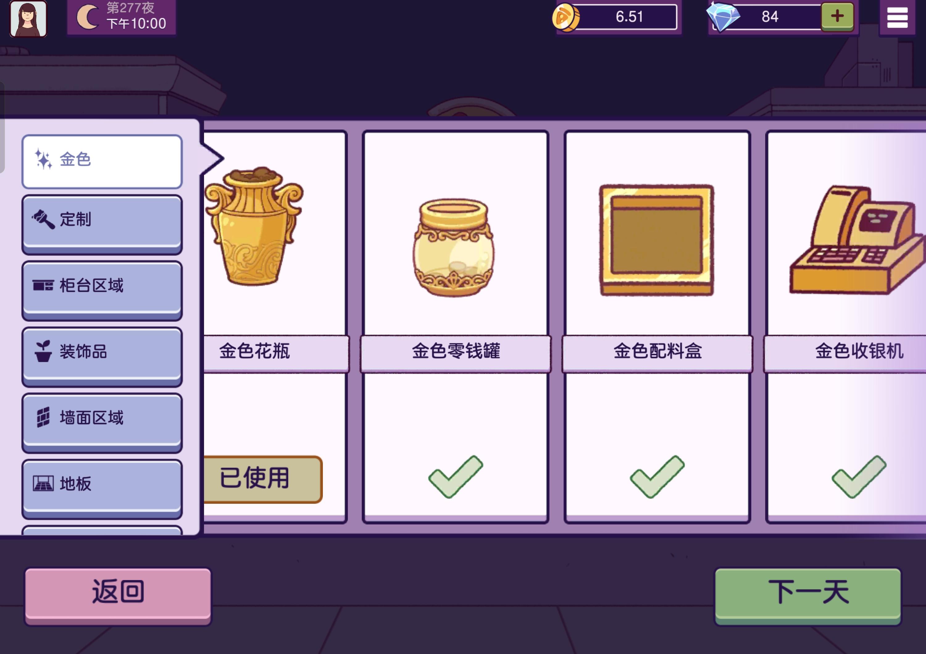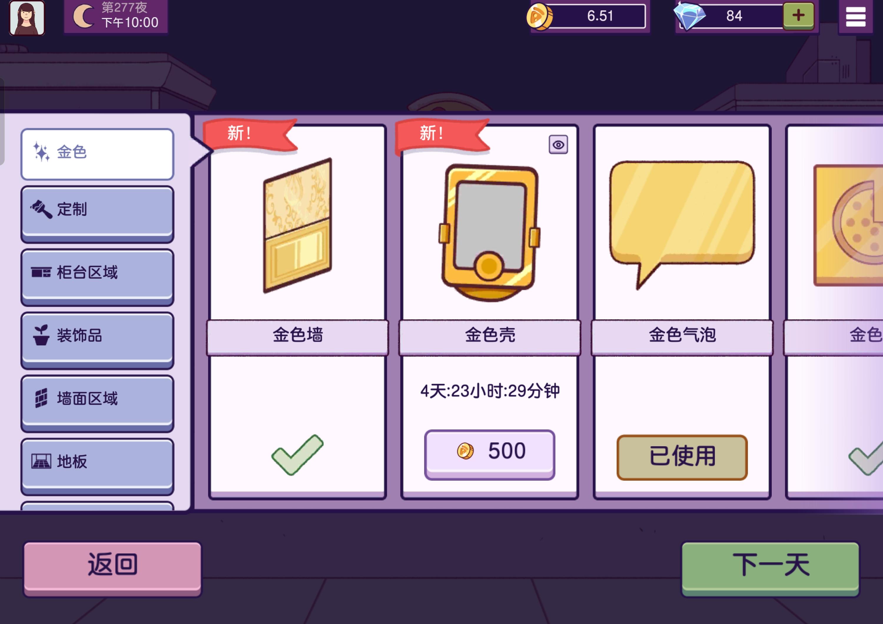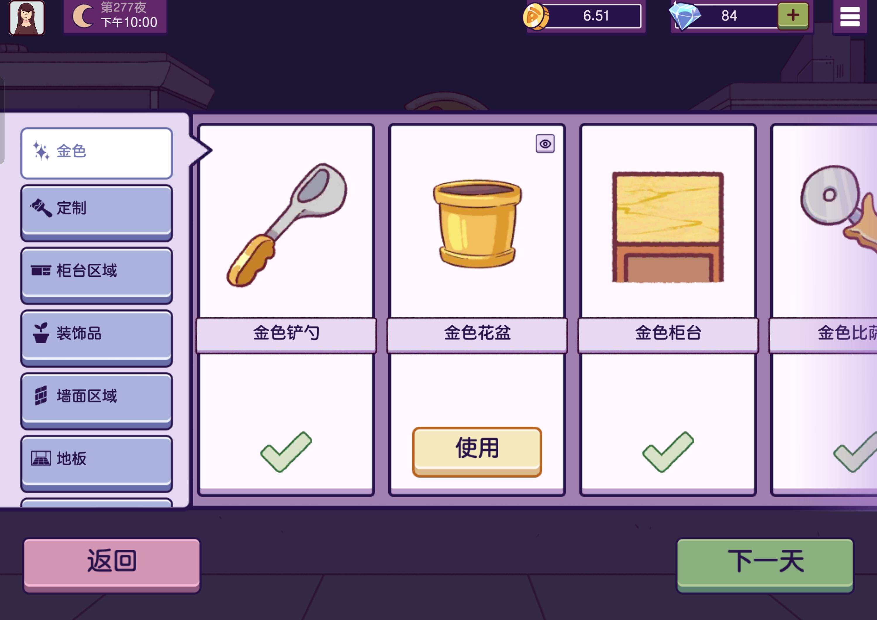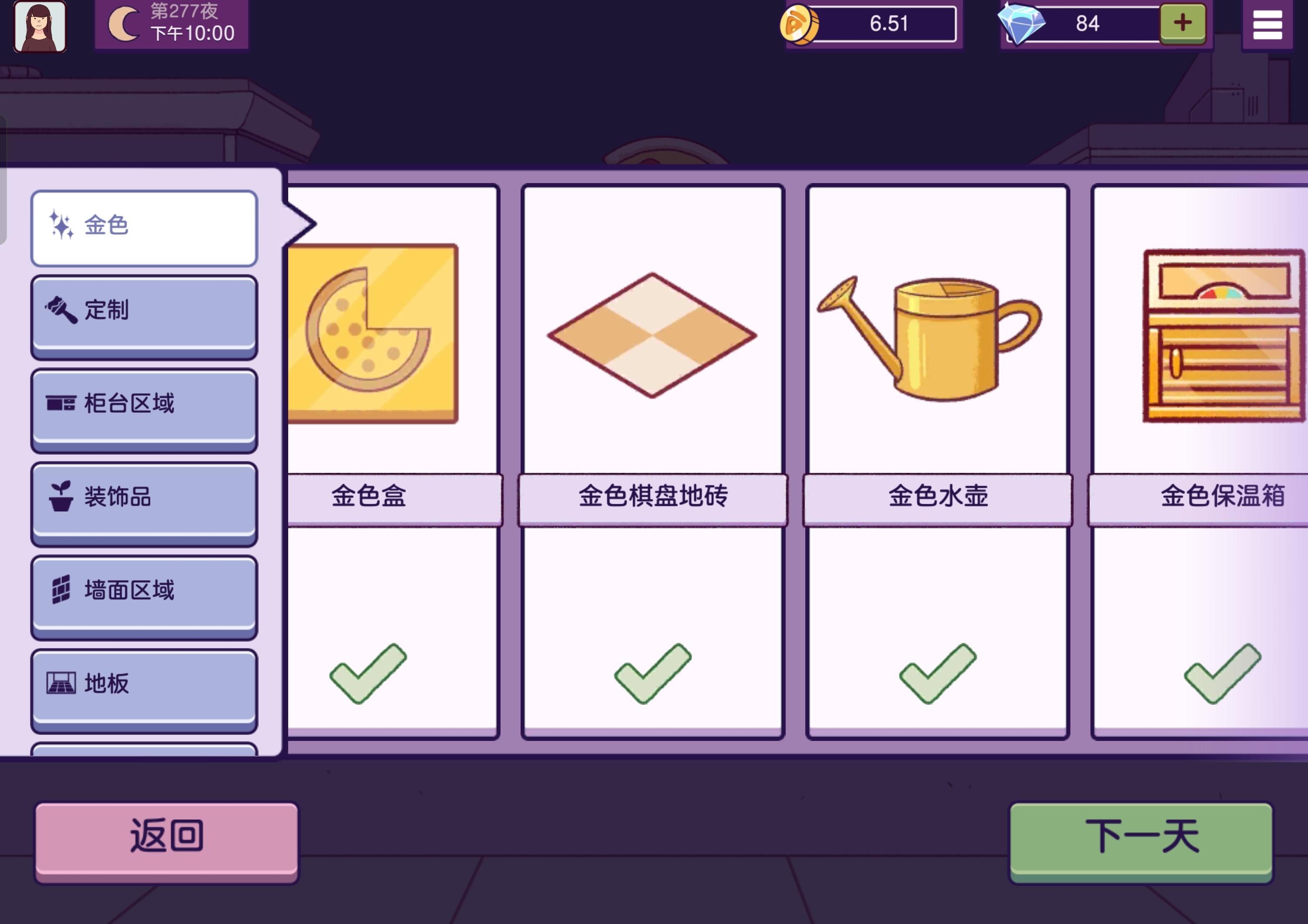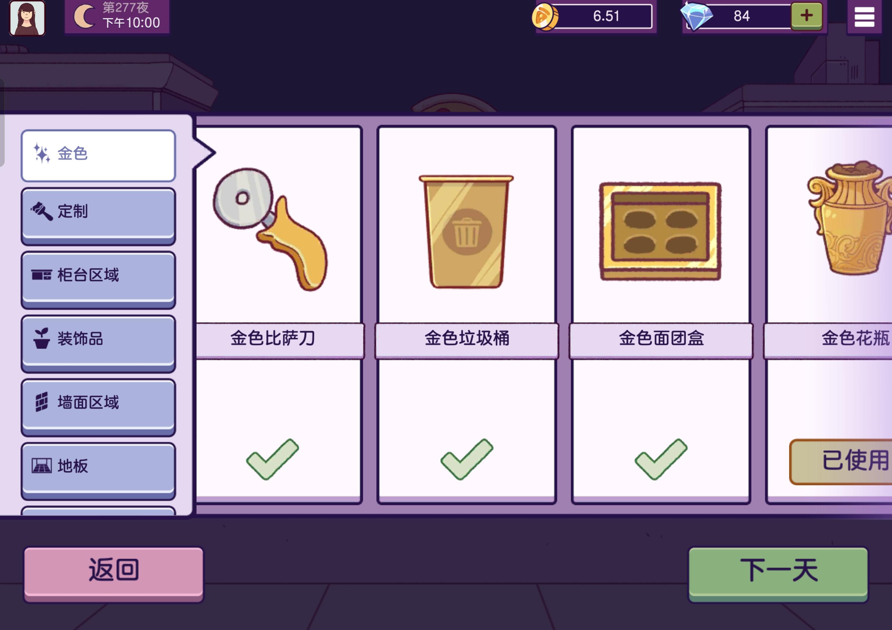 为什么披萨板、制作台、切分台、包装台的金色装扮没有返场,不集齐一套装扮总感觉看起来怪怪的,还有披萨的利润能不能提高一点,真的好肝