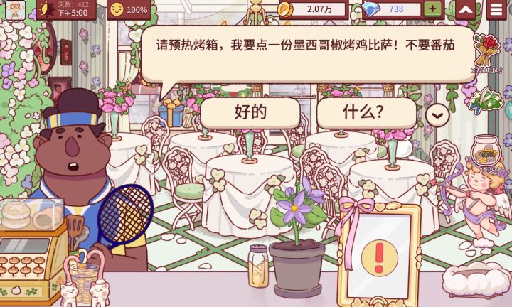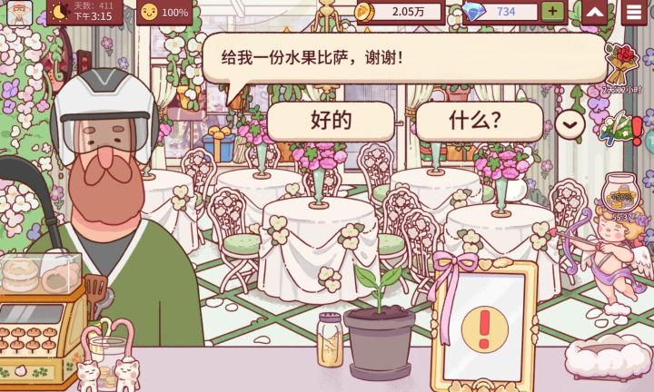 首先主界面新开存档(慎重考虑,新开后找不回来原来的)然后进入游戏第一天点三个【是】直接跳过给大胡子做饼给所有客人做披萨都要问一句【什么?】,以便于刷成就。之后提前做好三个芝士披萨(第一天好好玩)第一天结束后得到那个paid,得到第一个钻石第二天开头可以得到两个钻石,累计三个第二天开始全程烤大饼上阵,主要是为了省时间途中可获得6个钻石,累计9个(左上角文字存在钻石数量错误,请不要在