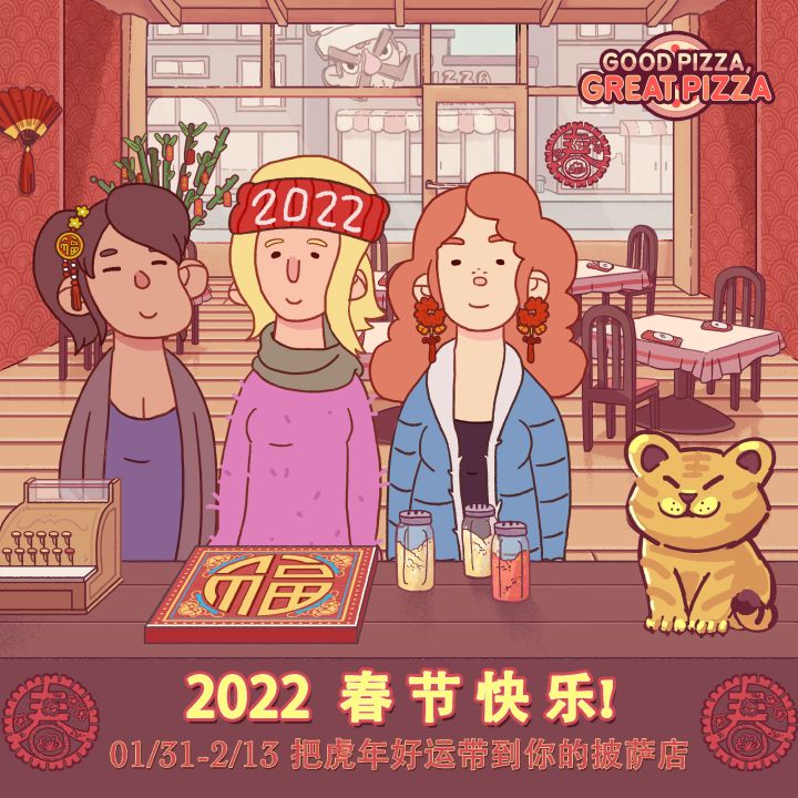 🧧2022年春节限时活动(1/31-2/13)🧧的小剧透:• 最可爱的吉米小丝变装惊喜回归!• 12+充满年味儿的店内和菜园装饰!• 20条新鲜有趣的披萨快讯!• 每日福利收藏!• 优品金色小脑斧摆件!❗️划重点:新版本4.3.0预计下周上线,届时请及时更新才能参与到春节活动哦❗️