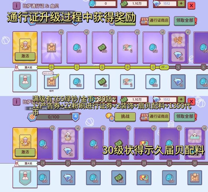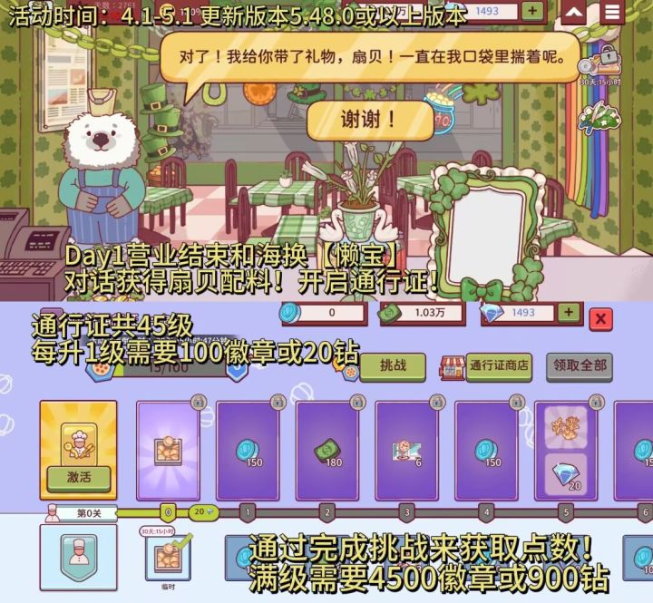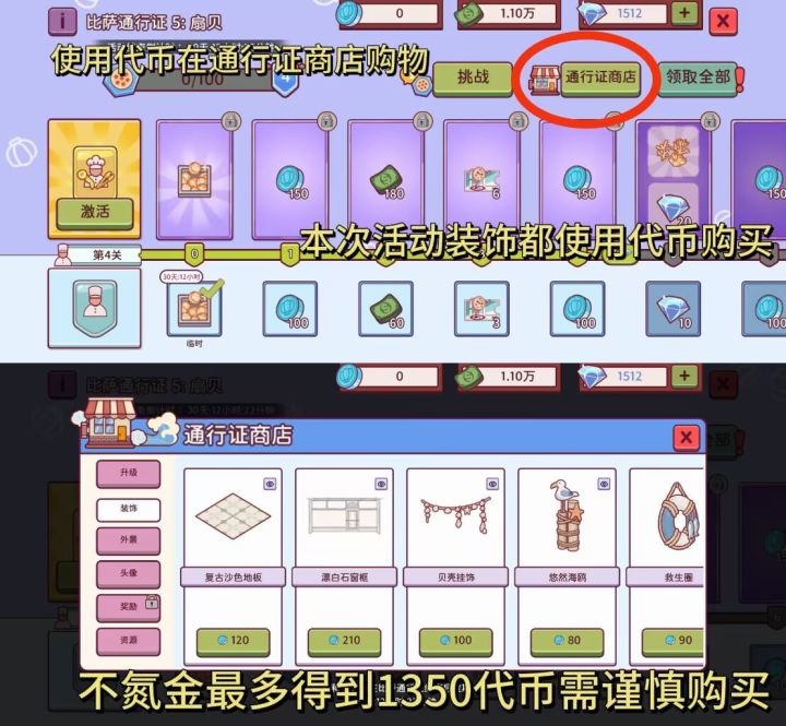 海洋通行证活动攻略活动时间:4.1日~5.1日代币助手600饼书360代币装饰1520代币外景1120 代币以上装饰合计:共需要3600代币其中还包含一款扇贝配料皮肤一珊瑚扇贝[一共有4125代币是氖完中级/高级版获得的代币,剩下扇贝币的可以拿去兑换钻石和比钞票/金币]0氮获得的代币为:1350个需要注意的是:此次并未返场任何往期通行证配料!!!扇贝配料需要通行证达到30