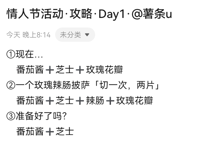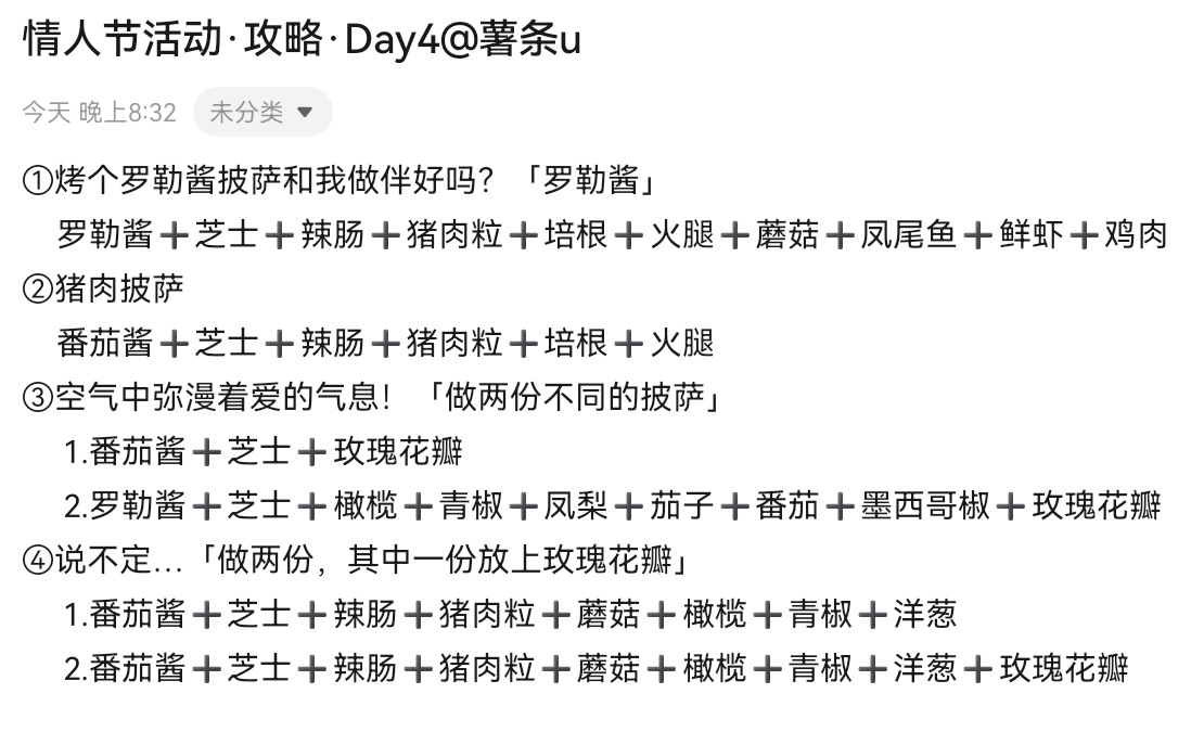 求助为啥我的披萨上面没有情人节活动啊?目前已经打完第四章了,游戏也进行到第117天了。之前的那个丢的存档活动都是正常更新后有的,现在这个新的存档前几天的浪漫装扮也有更新,为什么今天的情人节活动没有啊?😭
