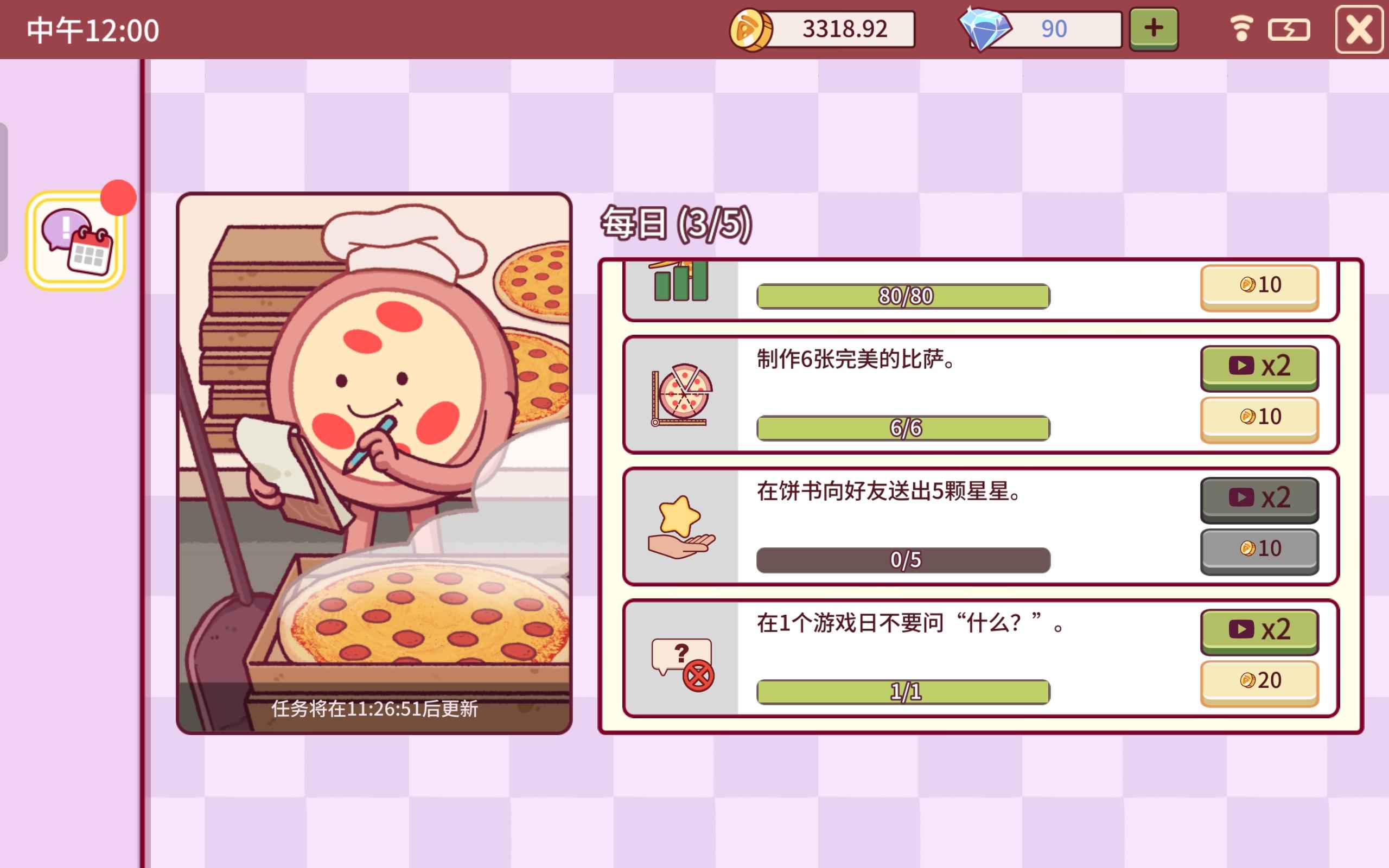 1.建议看攻略,提前背一点,找靠谱的攻略,很多都有错误,提前看评论区有没有纠错的!一定要找正确的,不然需要花2钻石重新来,第二次4钻石2.把增加好感度和烤箱加速都用上3.水果披萨和蔬菜披萨需要格外上心!水果有八个,蔬菜是五个加上玫瑰花瓣,数一下少没少4.一个活动点需要半小时恢复,全部(50)活动点25个小时就恢复满了,把握好这个时间大概就是这些5.做的时候放平心态,完成时间很充裕,有时候