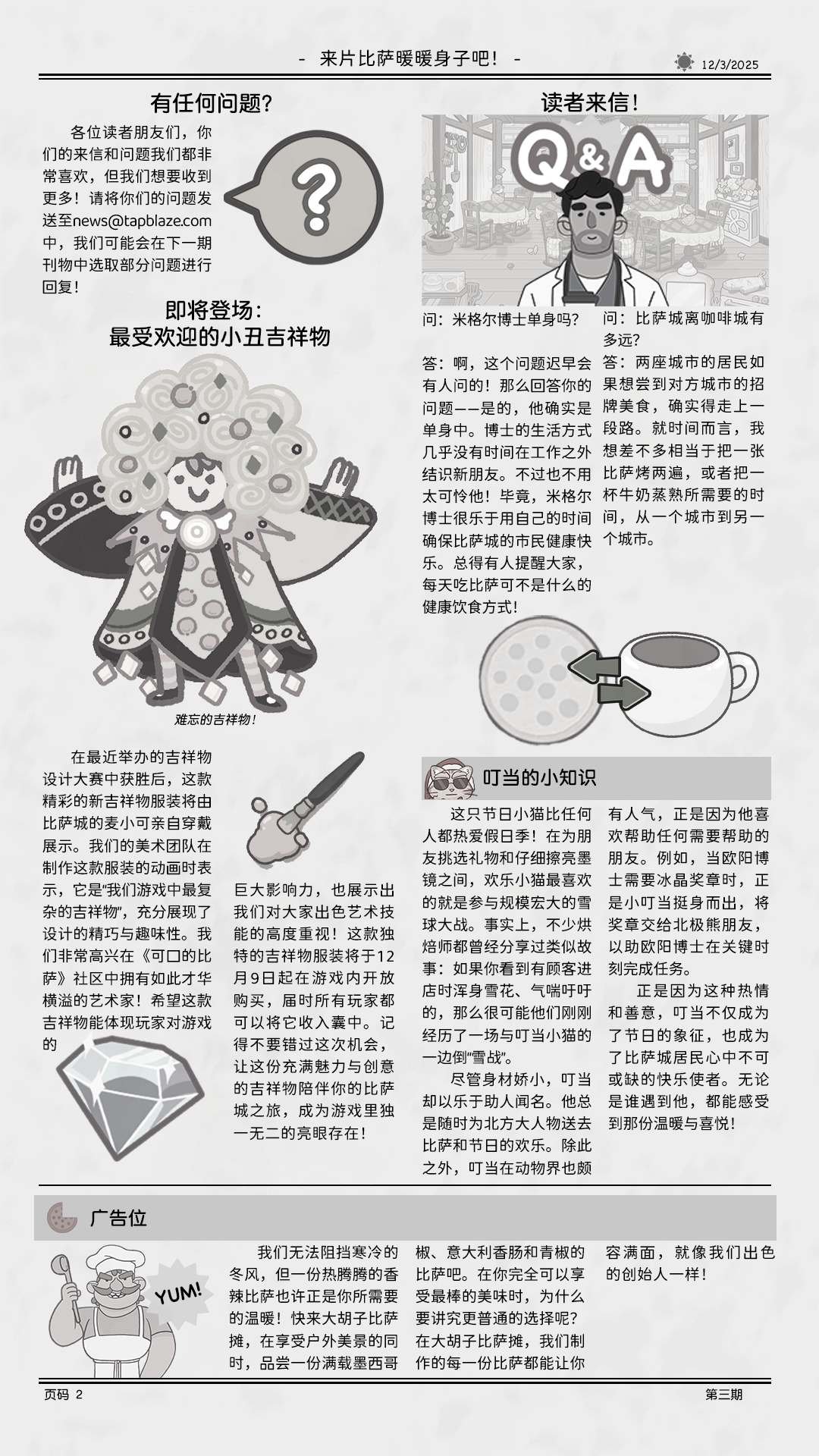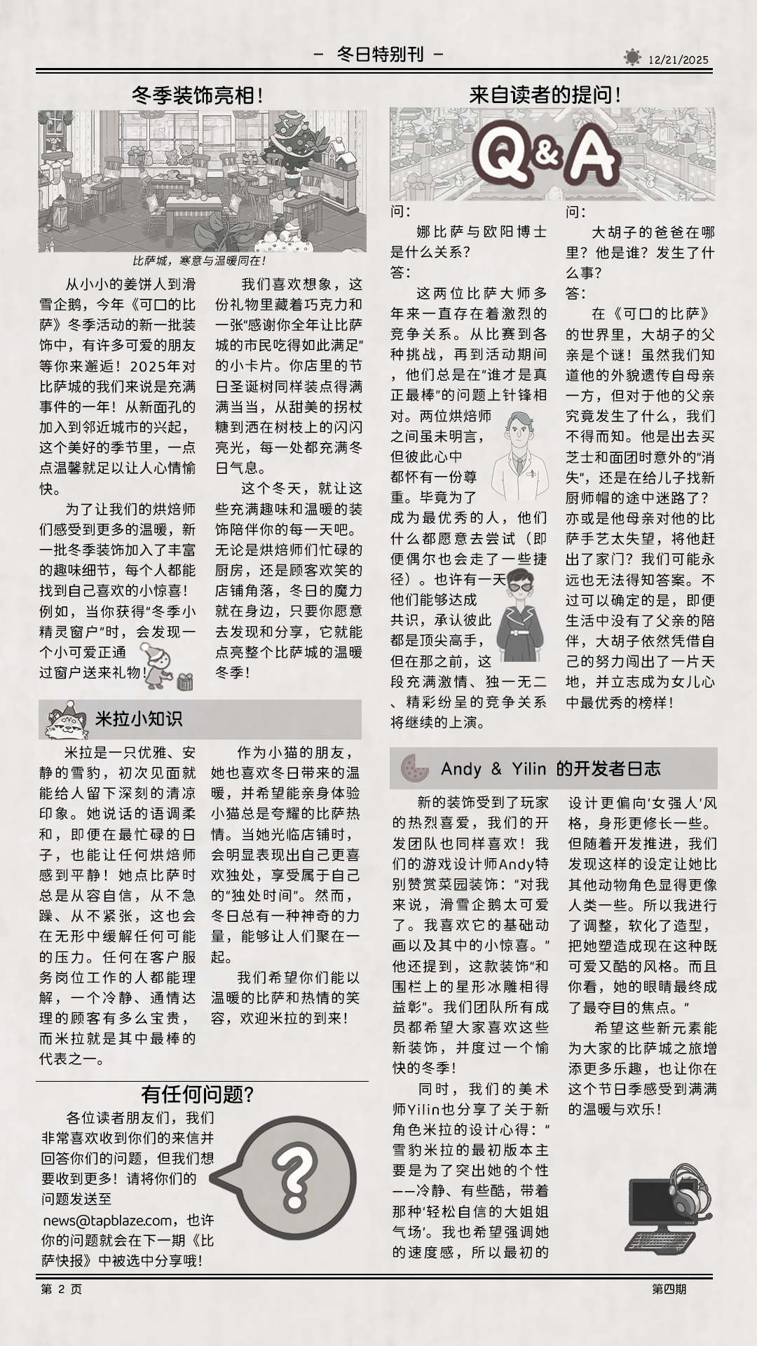保持关注: 🗓 上架时间:12 月 9 日 – 12 月 29 日 23:59(当地时间) 今年,全新的冬日厨房套装将比官方冬季活动提前 1 周上线!准备迎接可爱的节日动物、温暖的假日氛围,以及充满红色、姜饼、木质与雪景元素的厨房装饰吧!☃️❤️ 🧤 抢先预览: • 共包含 11 个充满节日气息的细节: 酱料勺、配料盒、面团盒、垃圾桶、操作台、比萨板、烤箱、切割台、打包台、比萨刀 & 保温箱,全部