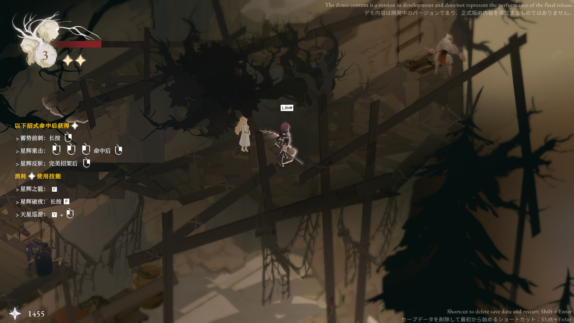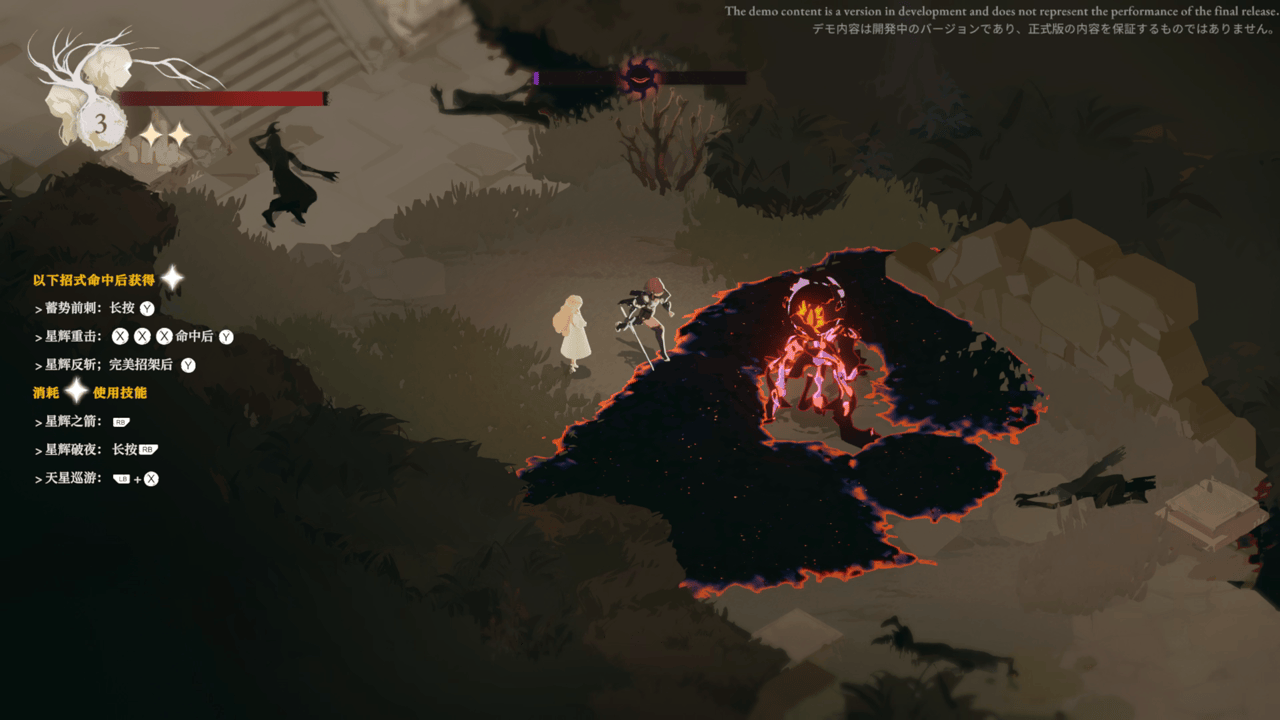 《星之旅》作为一款俯视角的动作类魂游戏,玩家除了操作少女剑士外,还有一个“米凯拉”会协助玩家一起战斗。本作的战斗主要资源就是来源于共鸣,所以非常非常鼓励玩家使用各种特殊的攻击在战斗中获取战斗资源。虽然玩家主要操作的是少女剑士,弹在背后的少女会跟随玩家的锁定和攻击的目标进行协助攻击,与少女剑士的长剑近战攻击,背后的这个少女使用弓箭。