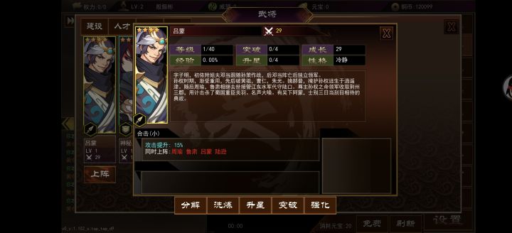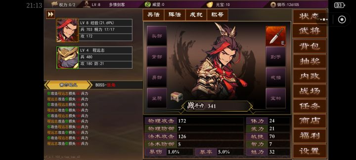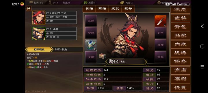 刚玩就好多bug,卡在这里啥也按不了,字本来就小,还横屏变竖屏清后台重进也不行,另外游戏模式好像是抄的另一款三国挂机游戏