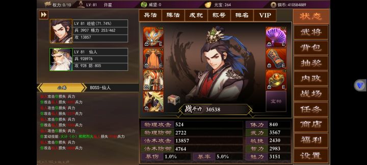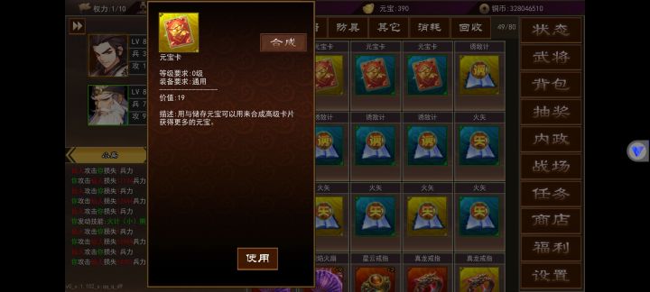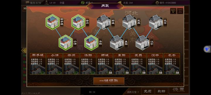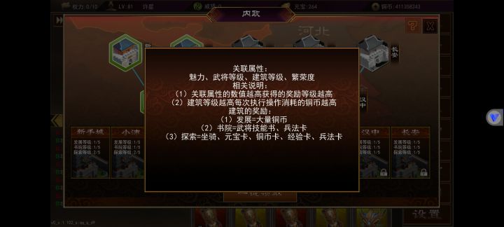 武将内政在角色50级还是55级开启来着,不记得了不过到等级就会开启第一个城,里面一共有3个可以内政的,上面图里有详情。内政等级不要升级,不要升级,不要升级,重要的事情说三遍,升级后原本只需要30级的武将就要40级的,对于平民玩家来说太难了,内政一般用平时抽装备的时候抽出来的3星武将,升满级30级刚好内政,内政影响最大的就是魅力值,一般做出75级武器就有2000+的魅力,不过这得看脸,附加的各项属性