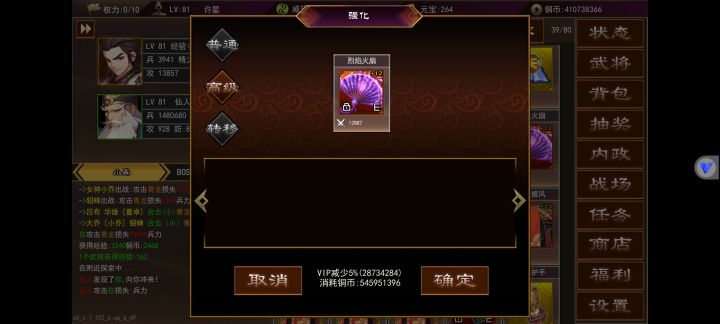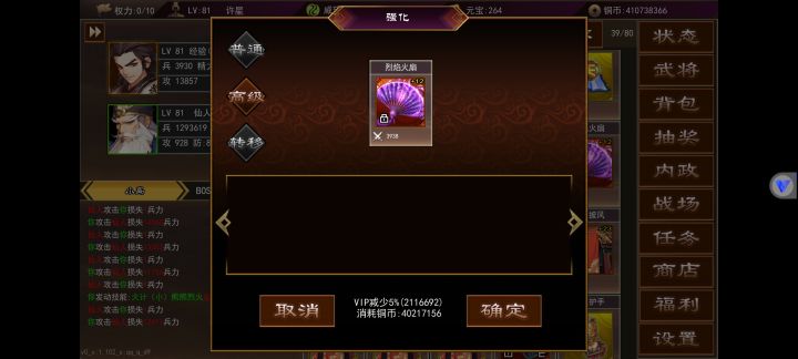 大多简易攻略都发完了,现在总结一下,进游戏最好先加官方群领兑换码,去游戏里点商店点神秘吧加速一打开,然后就是做做群公告的活动,有极品武将,4000w铜币,一张月卡,2000元宝,开了加速一后去地图英雄谷,在线或离线挂机升级,在35级的时候能做50级武器和55级防具等装备,推荐去商店里买蓝装合成黄装再合成红装,毕竟要用到75级-85级才会更换下一阶段装备,期间可以购买黄装合成垃圾红装去强化,优先强化