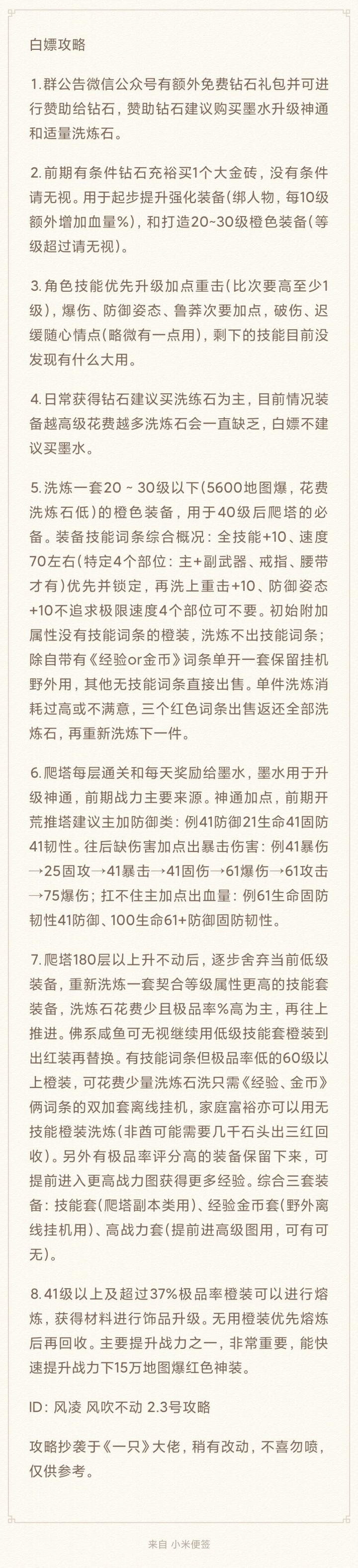 新手攻略1有实力的拉满技能,40级拉满神通开始起飞。一切氪服困难。 白嫖开局(直接上干货。快速攻略)开局进群福利领满福利(7千多钻石)买两个大金砖,买2000的技能石。剩下的买洗练石。洗1套30级以下的装备(40级推塔的必备),经验加成升级的必要。重点的速度和全技能1优先,后面带上重击和防御姿态。21级的武器洗不了速度(野生可能会出),洗练石不要浪费在这里。 有耐心的往下看。下面的