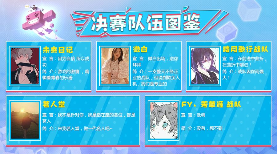 【小方说】 经过紧张刺激的角逐之后,进入十强的名单已经出来啦,恭喜这十强战队获得进入决赛的名额。以下为十强名单(排名不分先后): 1. 熊猫馆 2. 翠岚的暴风大妖涡 3.Asphyxia 4. NO.1 5. 宇宙中心 6. 茗人堂 7. 微白 8. FY、芳草涯 9. 未来日记 10. 踏月歌行 周六(9月22日)晚上八点钟,精彩纷呈的战队争霸赛决赛即将开启。走过路过的小方块们可一定别错过哟