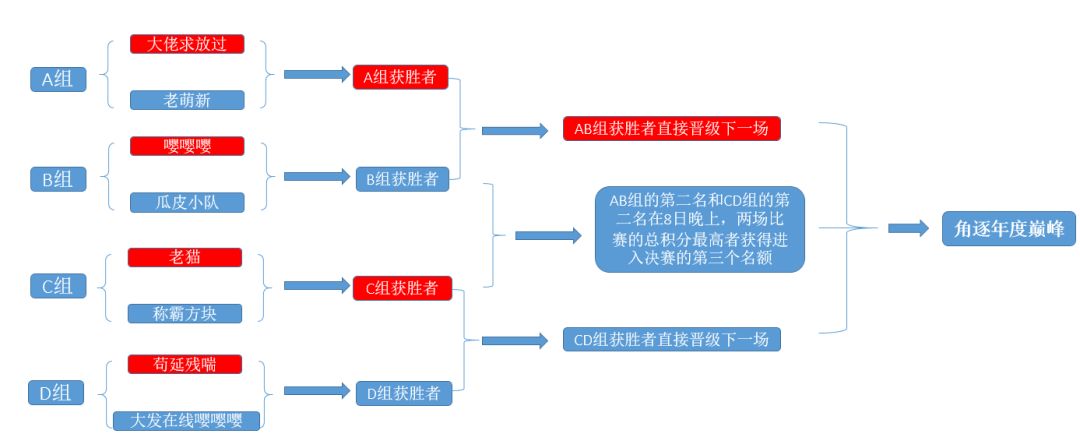 2018年12月7日-9日方块大碰撞成功举办了“欢乐三人赛,秀就完事了”的活动,8支队伍每晚22点进行对战,通过预赛、半决赛、决赛角逐出冠亚季军,“称霸方块”队伍在队长随钰而安(方块ID:222972)成员吨吨吨吨吨吨吨(方块ID:118176)、丸泽今天自闭了(方块ID:127363)共同努力下最终荣获冠军(欢迎大家关注三位方块总冠军选手,并送上可爱的小花花以资鼓励)。 (图1赛事分组图) 7