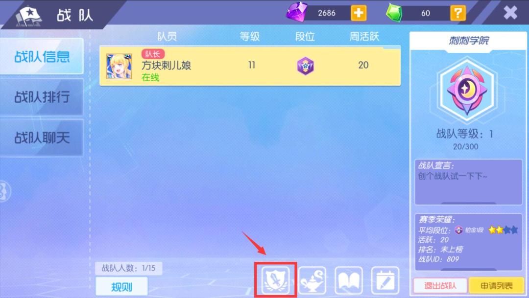 战队1V1超燃激战玩法上线!ヾ(≧O≦)〃嗷~战队单挑,凭实力说话,一决胜负吧!~ 玩法入口:在战队界面中,点击战队赛图标即可开启 积分赛玩法 (战队成员组队进行排位,获得积分,晋级联赛) 1、每周2—周4,19:00-21:00开启 2、战队积分,小组赛开启后,战队成员可通过参与排位模式,为本战队获得积分,获得的积分数量根据玩家排名、战绩等情况获得。成绩越高积分获得越多。 3、和战队内玩家一