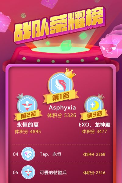 噔噔噔!战队赛已经进行到第三场啦,不卖关子啦我们先说一下昨晚的赛果吧~昨晚前三名的分别是【Asphyxia】、【永恒的夏】、【EMO、龙神殿】,前两名的优胜队伍将获得常规赛的优胜礼包哦!恭喜【永恒的夏】战队获得决赛的出线资格!而因为Asphyxia,EMO、龙神殿和和tap、永恒已在之前的比赛中获得决赛资格,所以【可爱的骷髅兵】将会顺延出线,恭喜吶o(〃'▽'〃)o 而获得昨晚比赛击杀榜MV