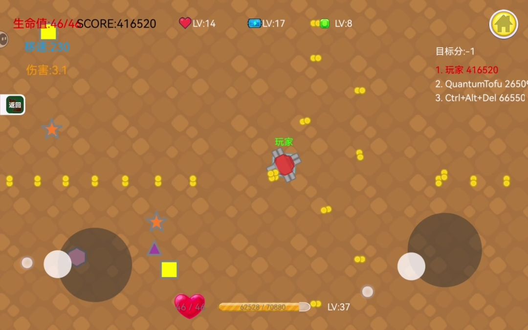 这个类型的老游戏我玩过,玩过最高等级是40多级可能50多级的样子,等到后期的话就全都是几乎满级的了,在老版本的话是能够升6个方向的,当然也不用全部见解以前的,然后半抄过来可以按照策划想要的方向去进行,不过他这个仍然有问题首先关于子弹的射速和子弹射击的频率都无法调整,射速无法调整,面临最大的两个问题,第1个是打出去的时候对面很好躲开来,第2个是攻速快的,很难形成密集弹幕,覆盖广泛为打击其次是,子
