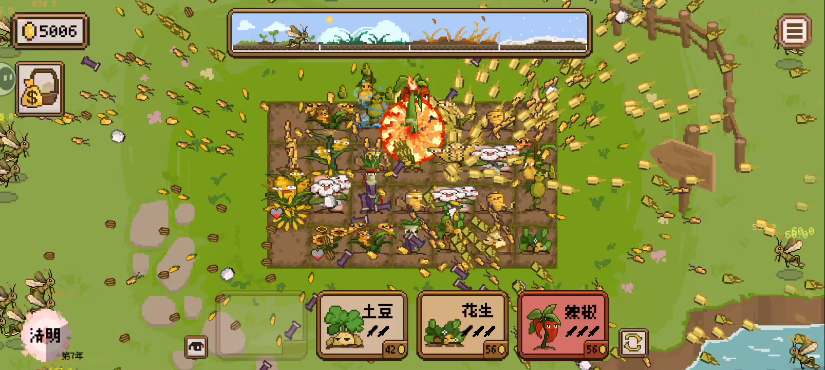 通关思路:1.如何熬过第一年请看图1,辣椒花生甘蔗水稻葫芦(死了)苗是番茄,辣椒花生是主力输出,甘蔗水稻提供经济(同时甘蔗可以提升花生输出效率),本人因为番茄出的太晚给葫芦害死了不然无伤过第一年(虽然第一年的葫芦就是准备送的)2.倒转流请看图2三葵,五麦,五稻,红萝卜四,白萝卜一,甘蔗五,葫芦一个(可不要只是为了容错),辣椒两个空两个格子卖牌或者学上一个写倒转流的(不建议玩后期太卡了建议中间去
