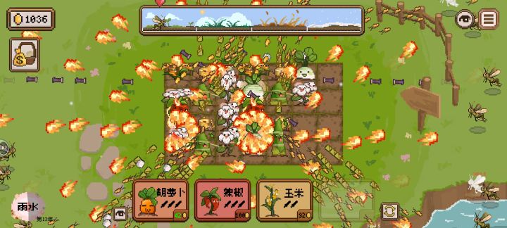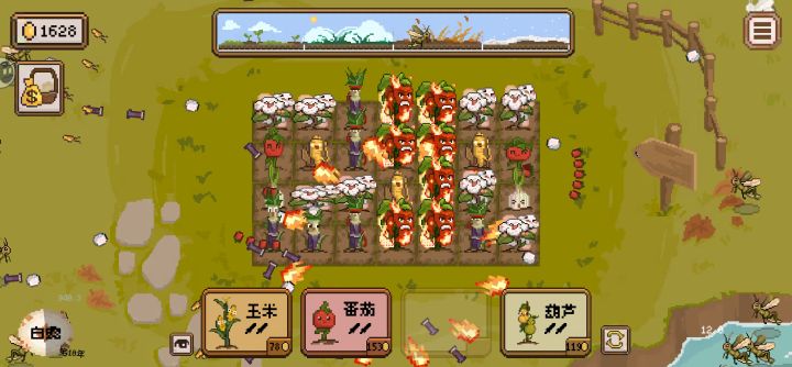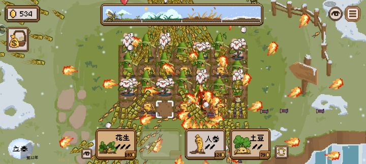 目前还是卡在17年,这次我把辣椒减少了两个,只用了6个辣椒。总共是10个棉花加一个二级棉花,每轮节气增加375%的伤害。其余的还是老套植物,人参加甘蔗加竹笋,固定两个水稻加金币。前15年都没问题,但是最后16年每次都会有一些年兽突破防线,吃掉我两三个植物。我的植物都是通过棉花大量叠加buff上来的,只要被吃掉了两个,那这一把就很难提升上去了。