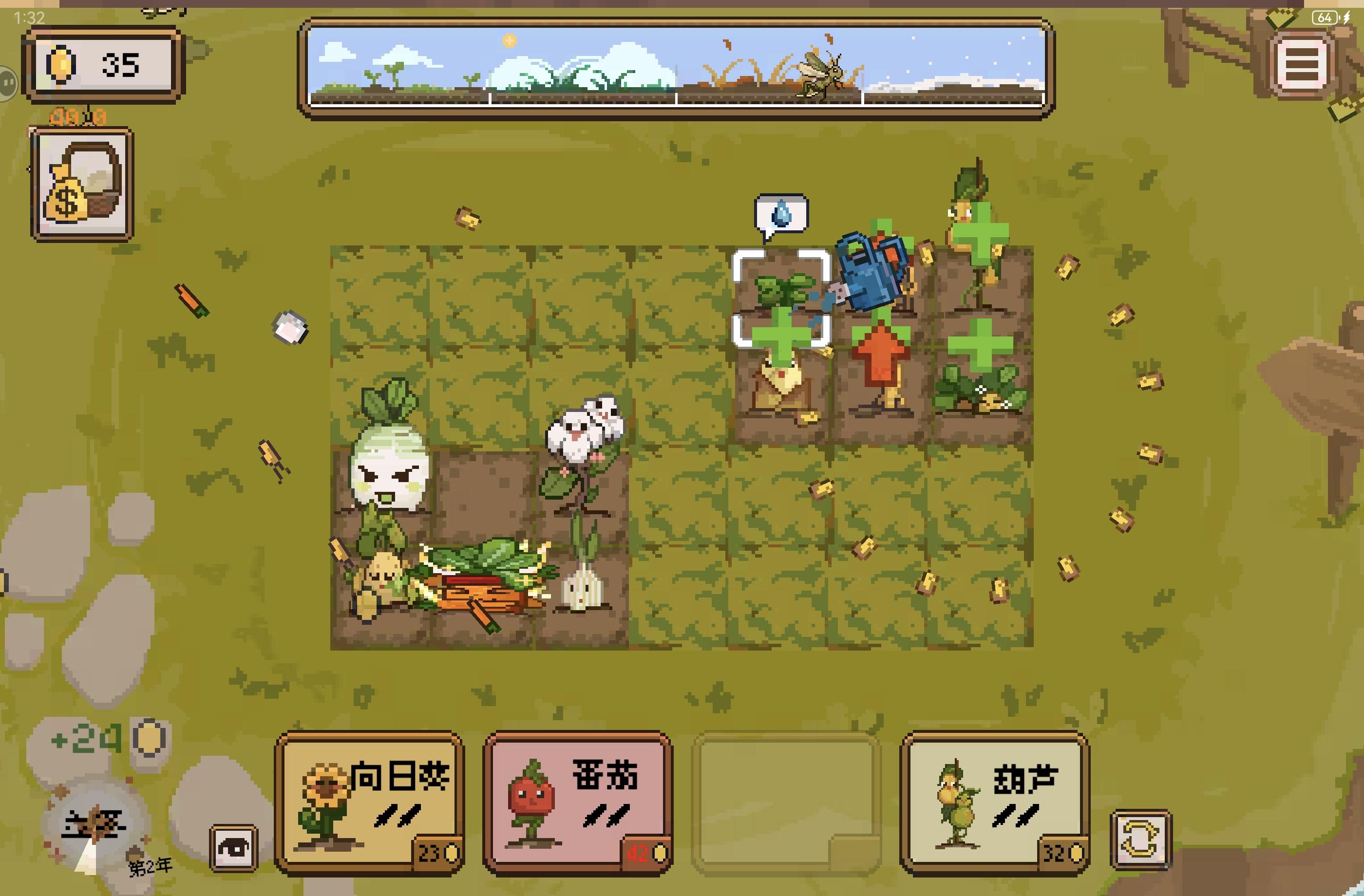 最近想了一些更新的内容,但是还是觉得植物池子已经挺深了,有点不想再加额外植物了,所以就想了一些额外的玩法,最后锁定了每年结束时选择一项道具进行提升,还有一些局外内容作为初始道具可以携带进游戏。如果大家有好的点子欢迎随时提出来~#丰收轮回