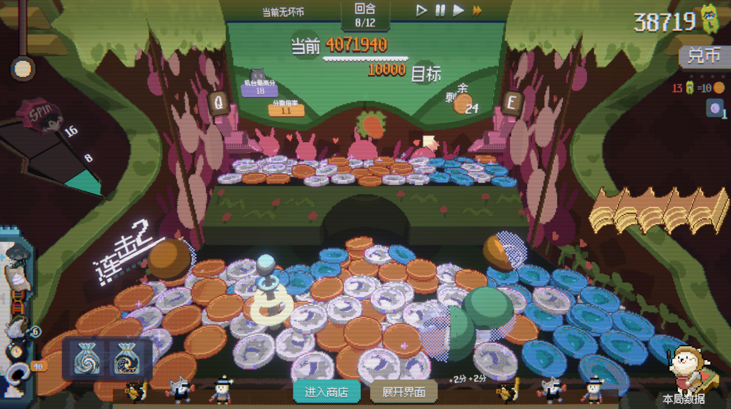 总体来说,游玩就是开局——投币——连击——转盘——过关——商店——下一关。通过芯片+特殊硬币+两个随机球技能的方式来提升每一回合的可玩性,持续掉落的硬币越多,倍率越高,倍率越高,转盘奖励越好,转到下一层后,会出现硬币塔,硬币塔被推下去的时候真的爽爆了,正反馈拉满。
