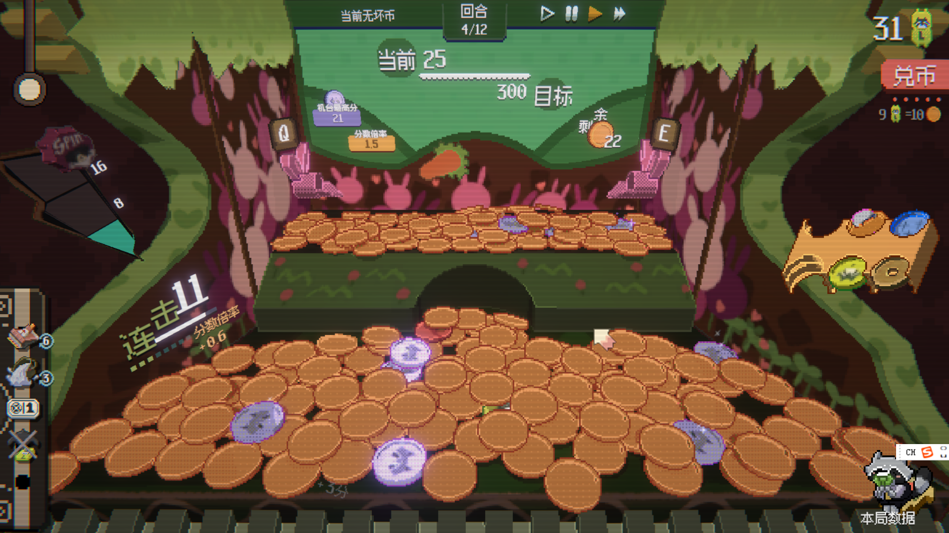 推币机版的小丑牌。爆金币的感觉太爽了,一秒回到学生时代无数个消磨在游戏厅的记忆。demo版的运气成分大于肉鸽套组。