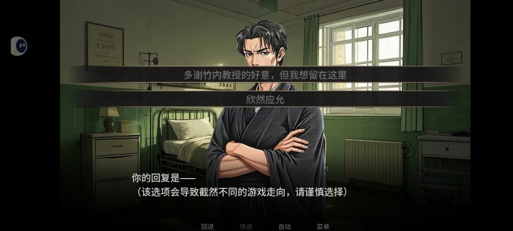 玩法也很棒,在触发be结局时可以回退到关键选择点,再重新选择,也就意味着可以用穷举法一个个试出来,对于我这种脑子不好使的很友好