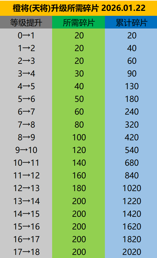 橙将(天将)升级所需碎片
