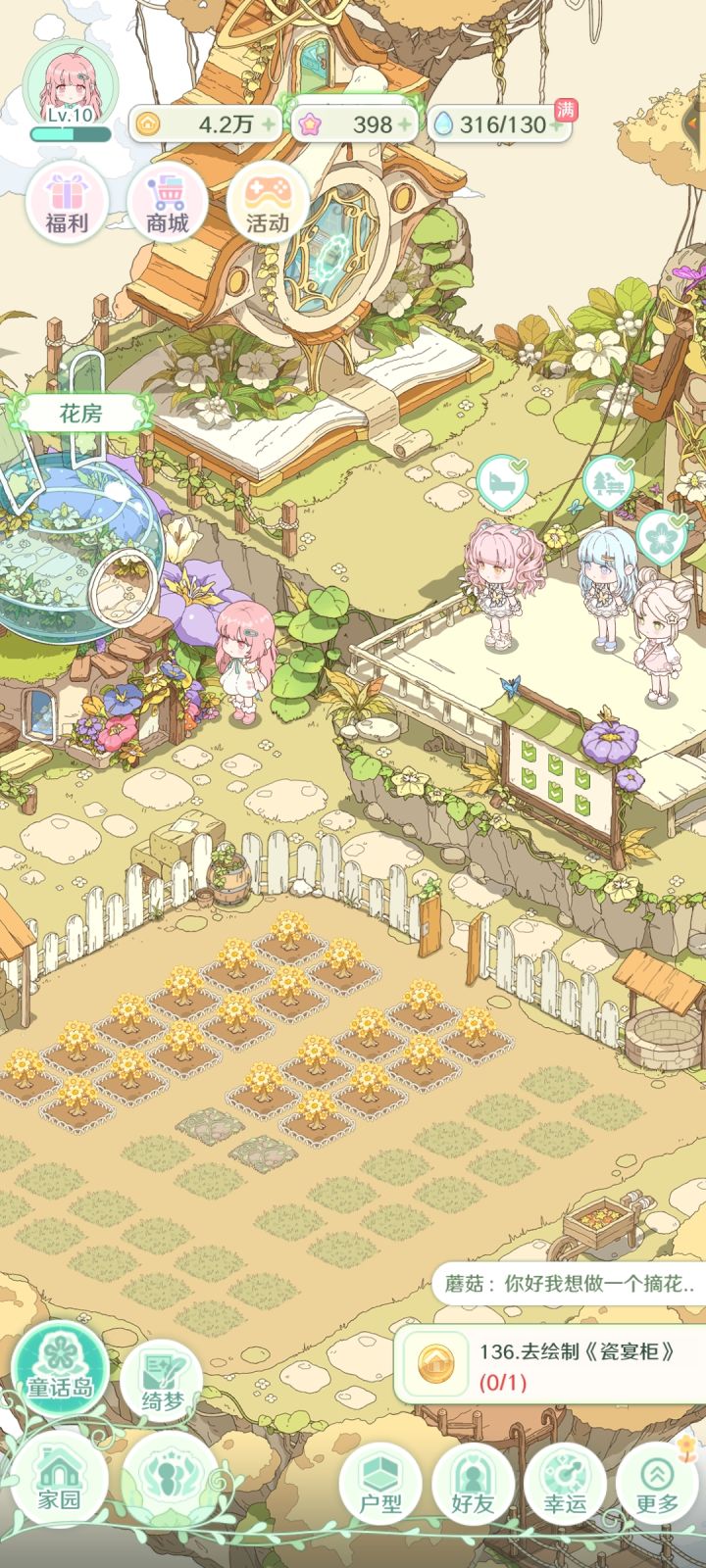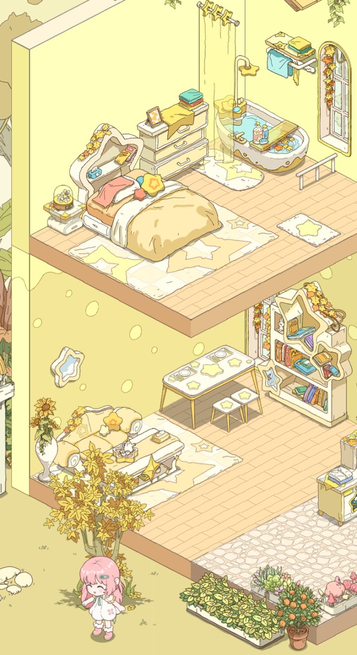 我是在小x书上刷到的,被画风和高自由装修吸引,总体还是挺不错,没有合成,就是种花做家具,卖花得币或者颜料,这俩也是做家具的必要东西。游戏种花比例比较高,装修反而占比没有那么高,游戏更像是农场一类,不过这个只有种花,装修感觉像附带的,不过看在装修家具还算丰富上勉强可以四星。