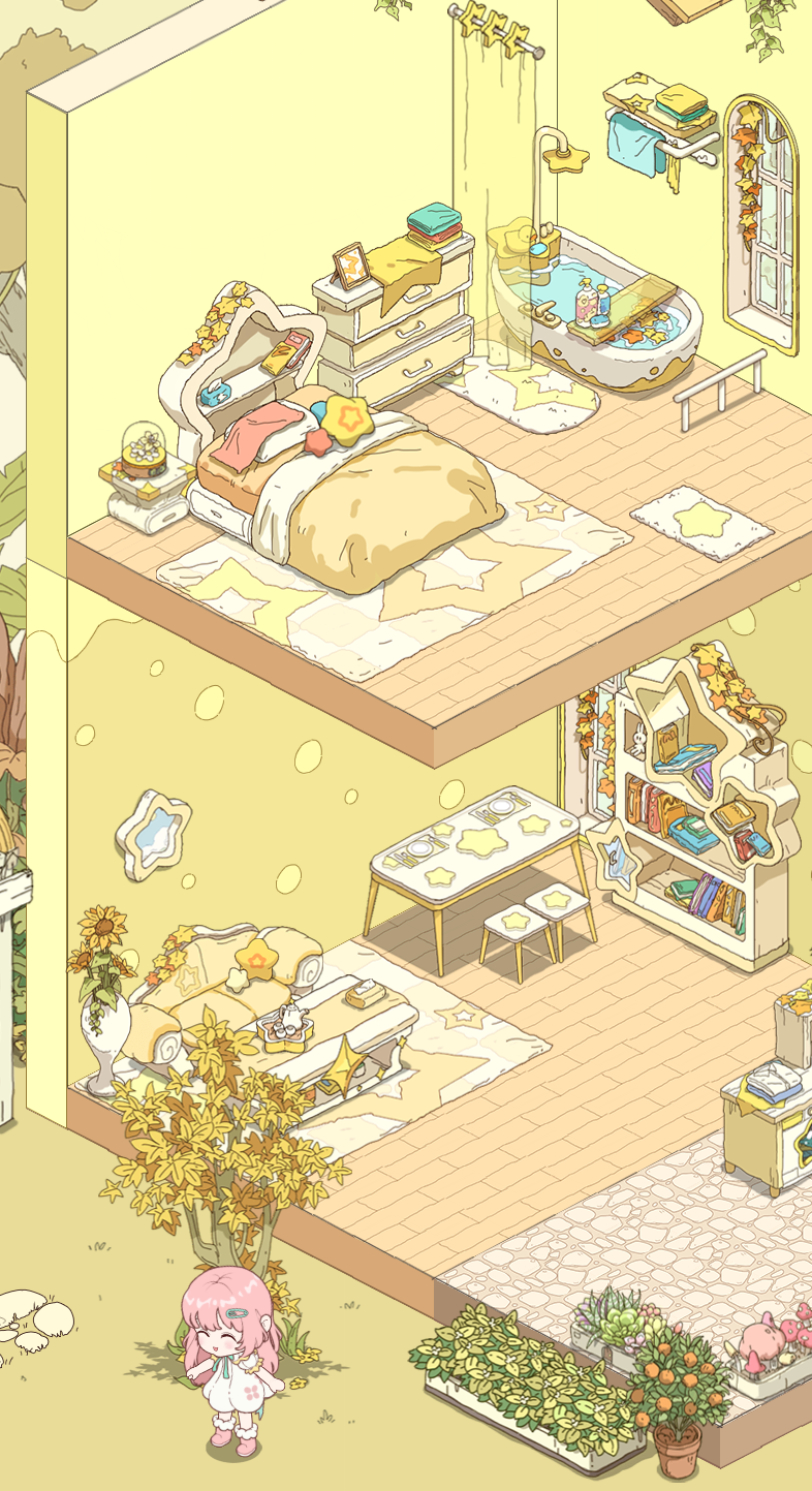 我是在小x书上刷到的,被画风和高自由装修吸引,总体还是挺不错,没有合成,就是种花做家具,卖花得币或者颜料,这俩也是做家具的必要东西。游戏种花比例比较高,装修反而占比没有那么高,游戏更像是农场一类,不过这个只有种花,装修感觉像附带的,不过看在装修家具还算丰富上勉强可以四星。