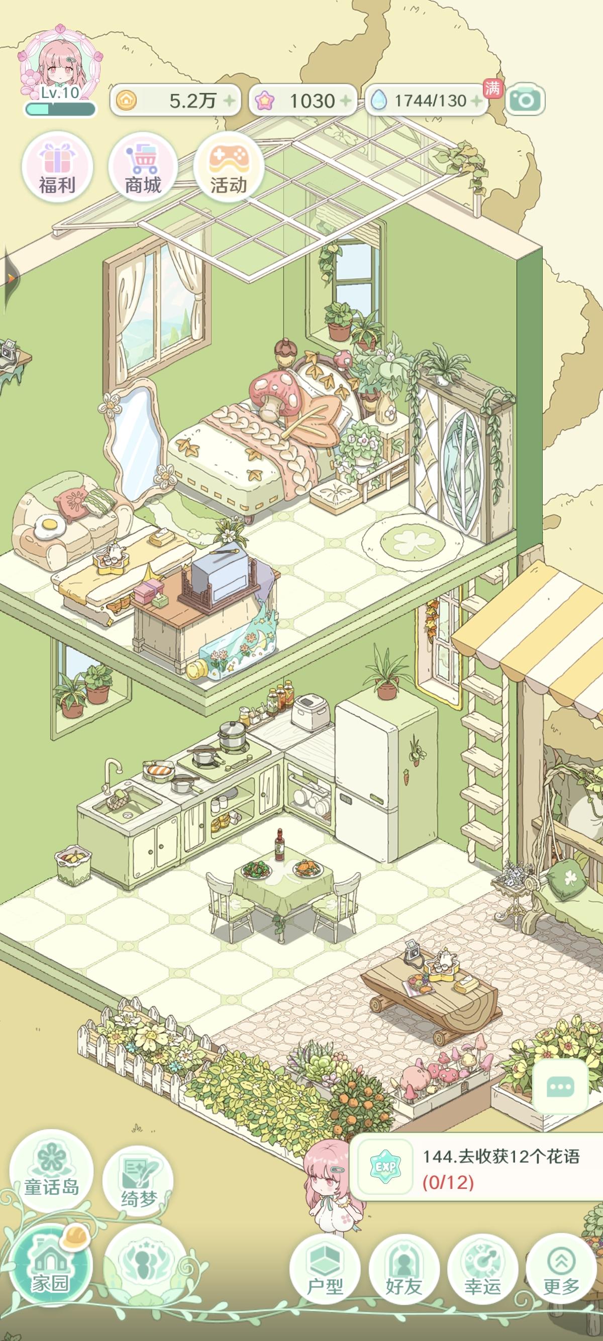 画风比较偏精致和梦幻,然后核心玩法是种植和装修带点经营,装修还是可以的,但是后期就是解锁那个装修用的,一个是货币,另一个则是是颜料,然后那个颜料不是很够用,然后户外装修也是有的,然后家具也不少,可以满足基本的家具要求。