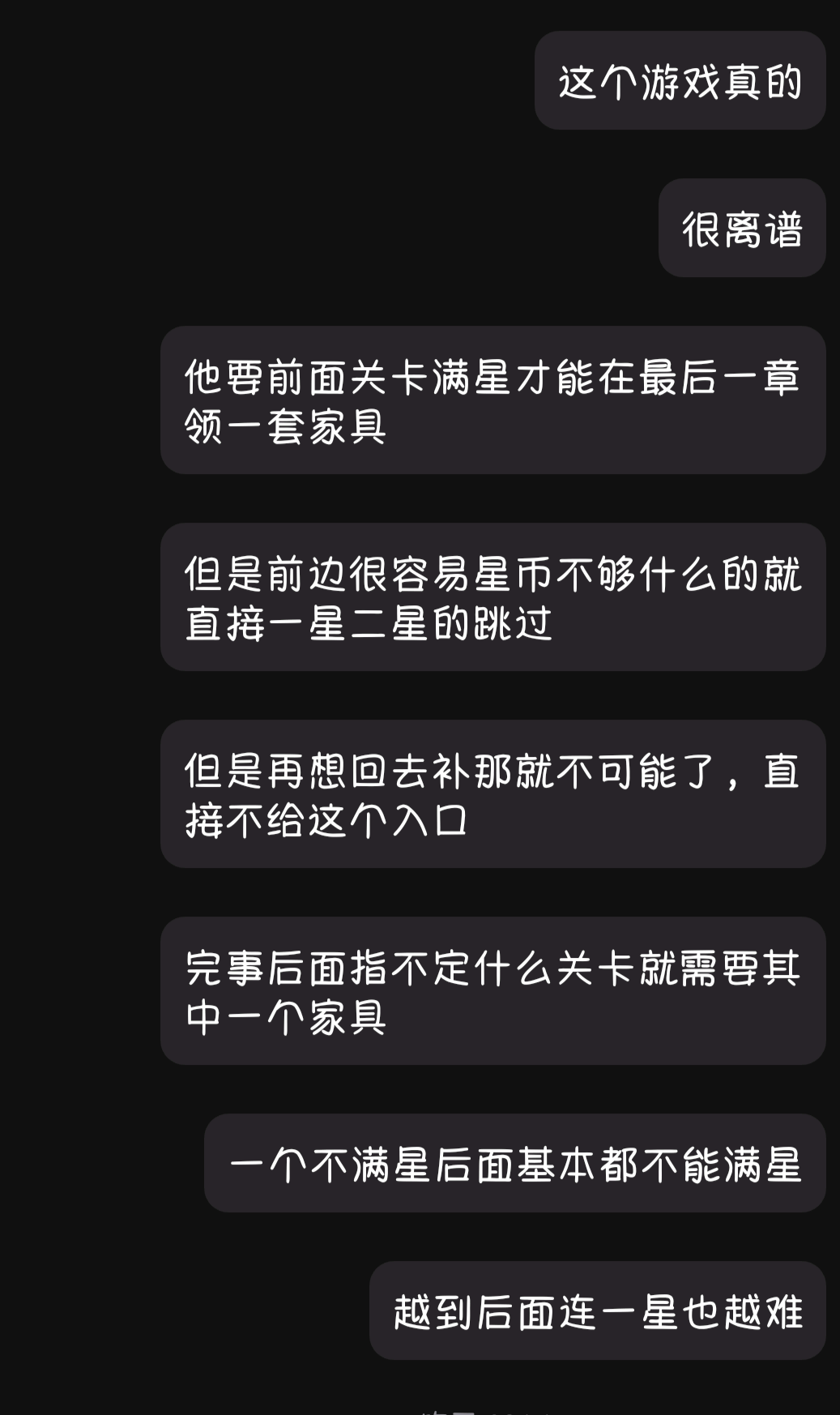 第一天有多爽今天就有多崩溃,前边不满星这点我确实不应该,我应该搞慢一点等一等星币出来之后,买上所有满足的直到三星再继续下一关,中间一梦过去也没有返回上一梦补星机会也行没关系,以为不满星拿不完东西也照样玩,但是这一关这是干什么呢?不搞到那个满星家具直接这一关过不去,这关过不去下面的主线任务也直接全线暂停,什么时候我能返回第四梦拿到满星家具什么时候这一关我才能过去中间很容易