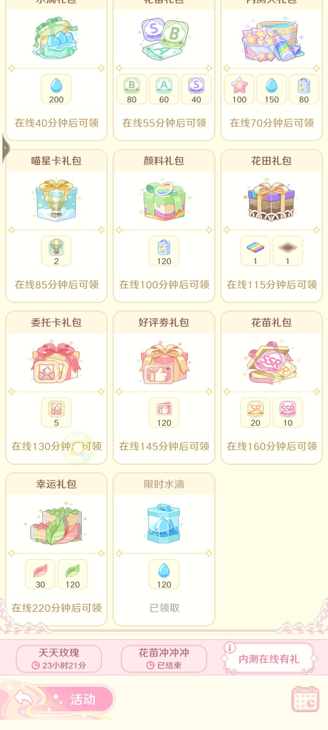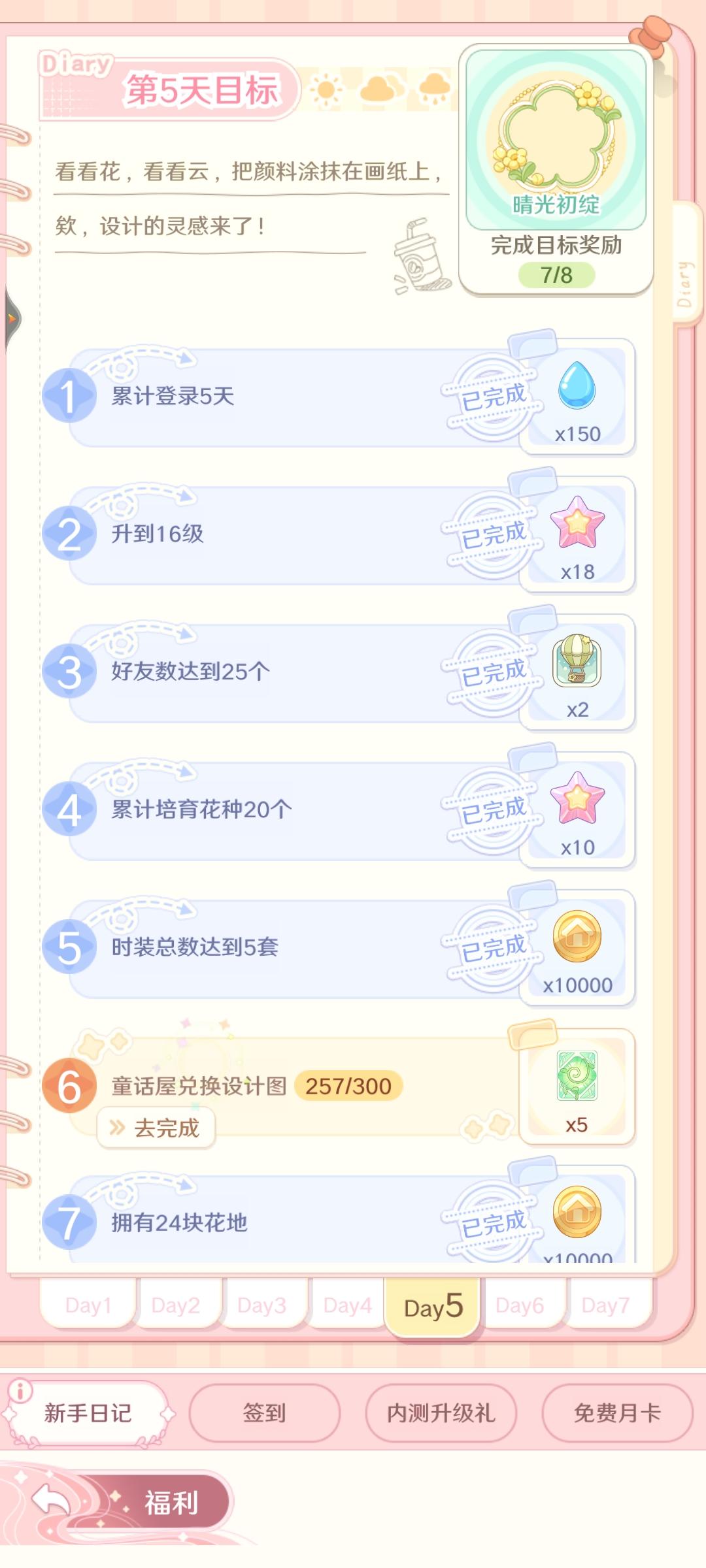 只玩了7天,意犹未尽。O(∩_∩)O~~重点刷等级了,到了8-2的时候就开始卡关了。 新手日记都没完成,兑换300张设计图的任务难度有点大,没有月卡的加持要很久才能完成。 花语属性升级的价值感觉很低。 小物订单每次只有3个,还有没解锁的花语,拒绝了还有,等有时候想刷订单等cd也很麻烦。 好物的刷新还要币就很舍不得,有个任务要买萌鸭立,等到第三天才买到。 小人如果能有其他动作就好了,走来走去,浇浇