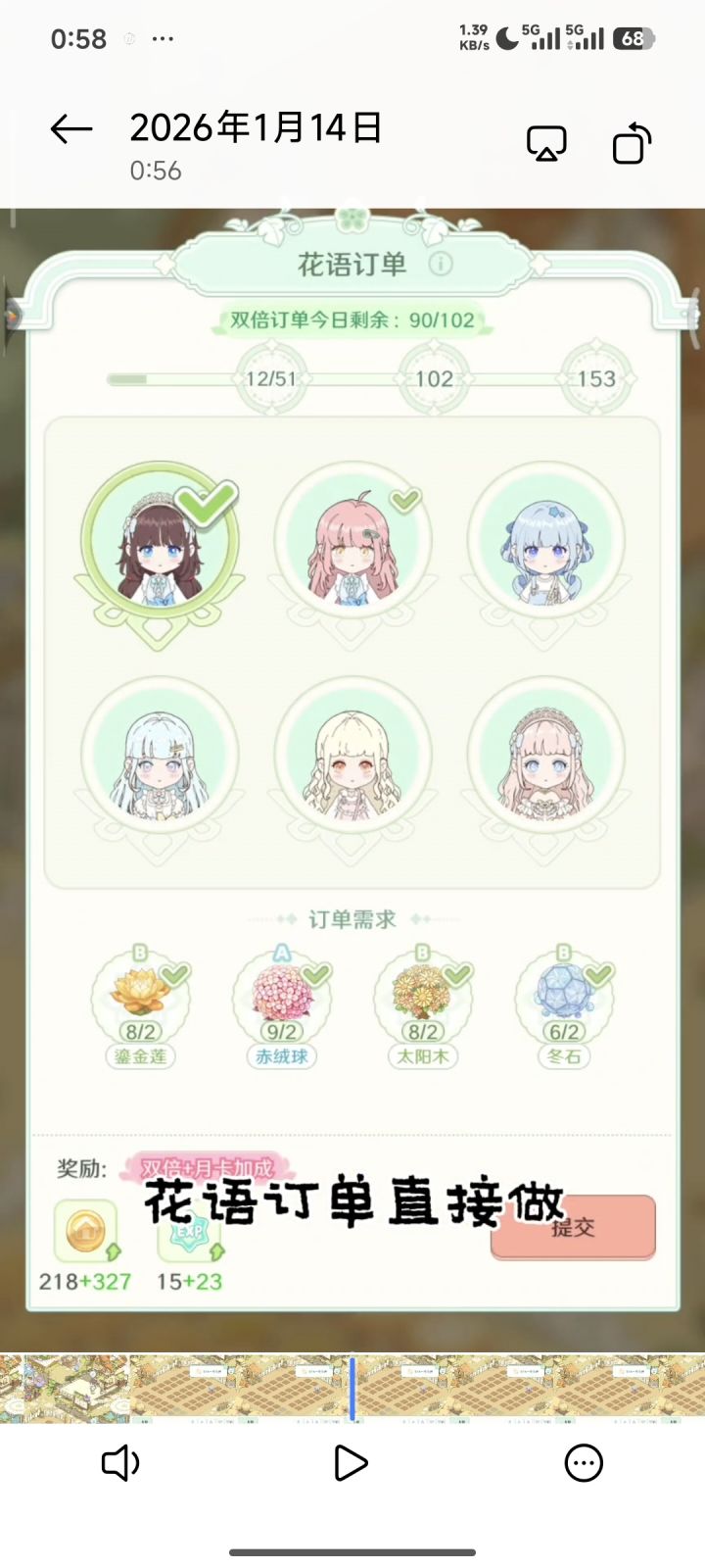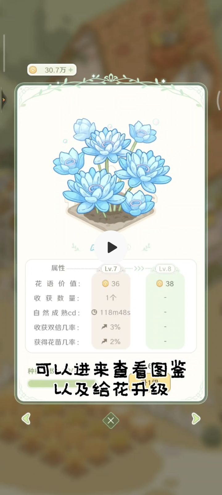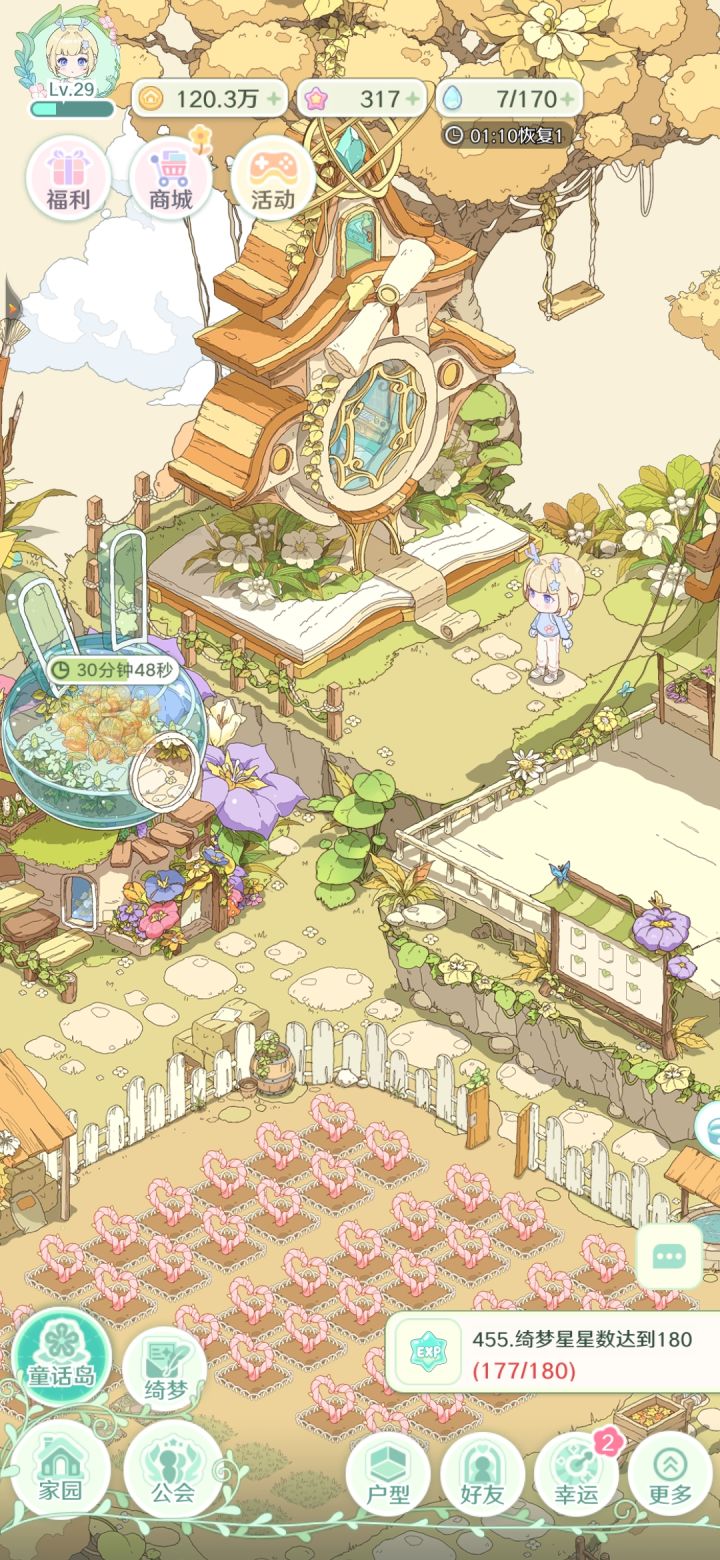 只玩了7天,意犹未尽。O(∩_∩)O~~重点刷等级了,到了8-2的时候就开始卡关了。 新手日记都没完成,兑换300张设计图的任务难度有点大,没有月卡的加持要很久才能完成。 花语属性升级的价值感觉很低。 小物订单每次只有3个,还有没解锁的花语,拒绝了还有,等有时候想刷订单等cd也很麻烦。 好物的刷新还要币就很舍不得,有个任务要买萌鸭立,等到第三天才买到。 小人如果能有其他动作就好了,走来走去,浇浇