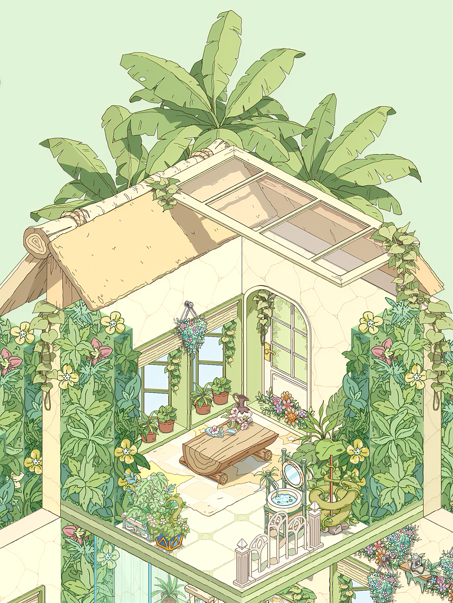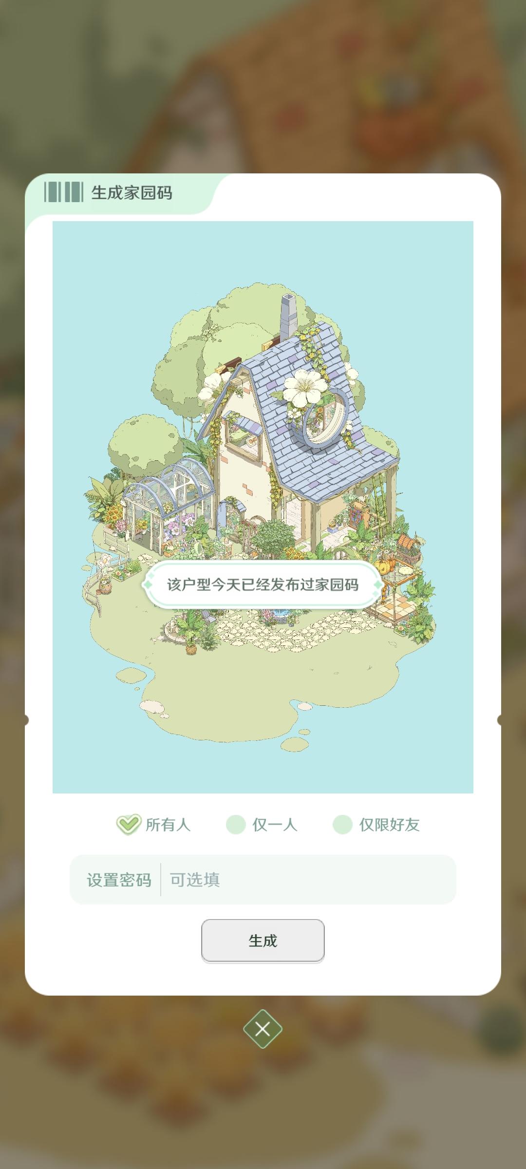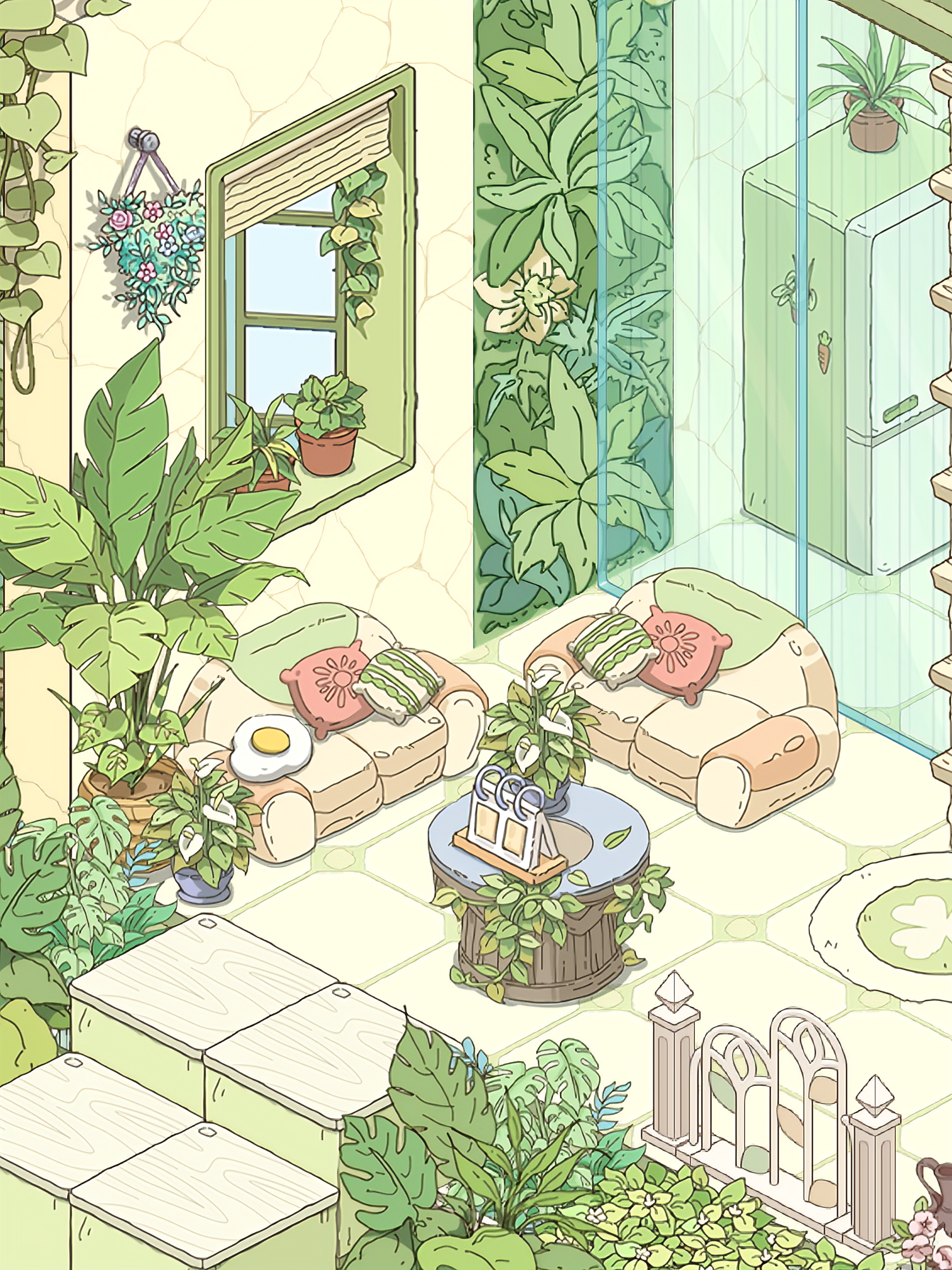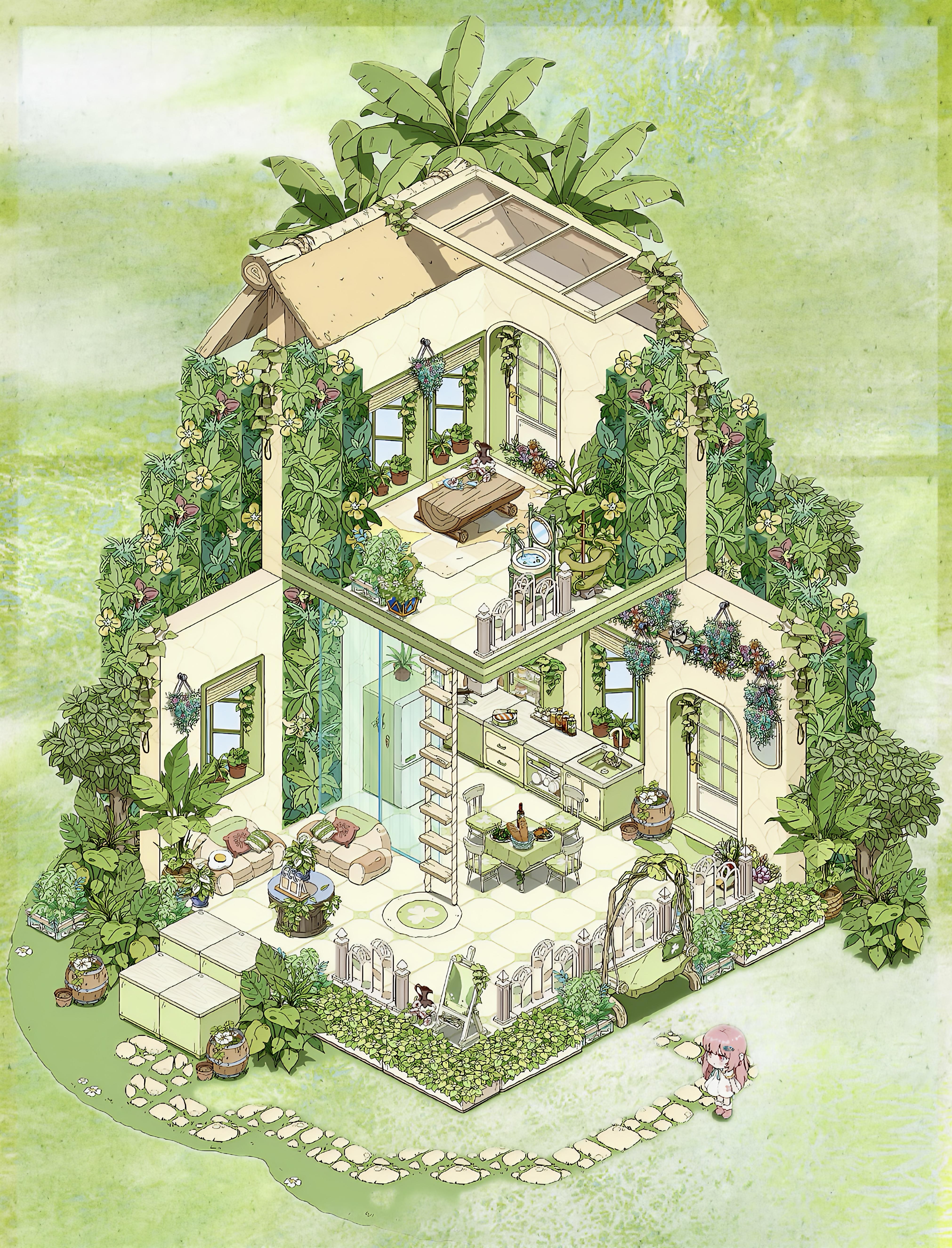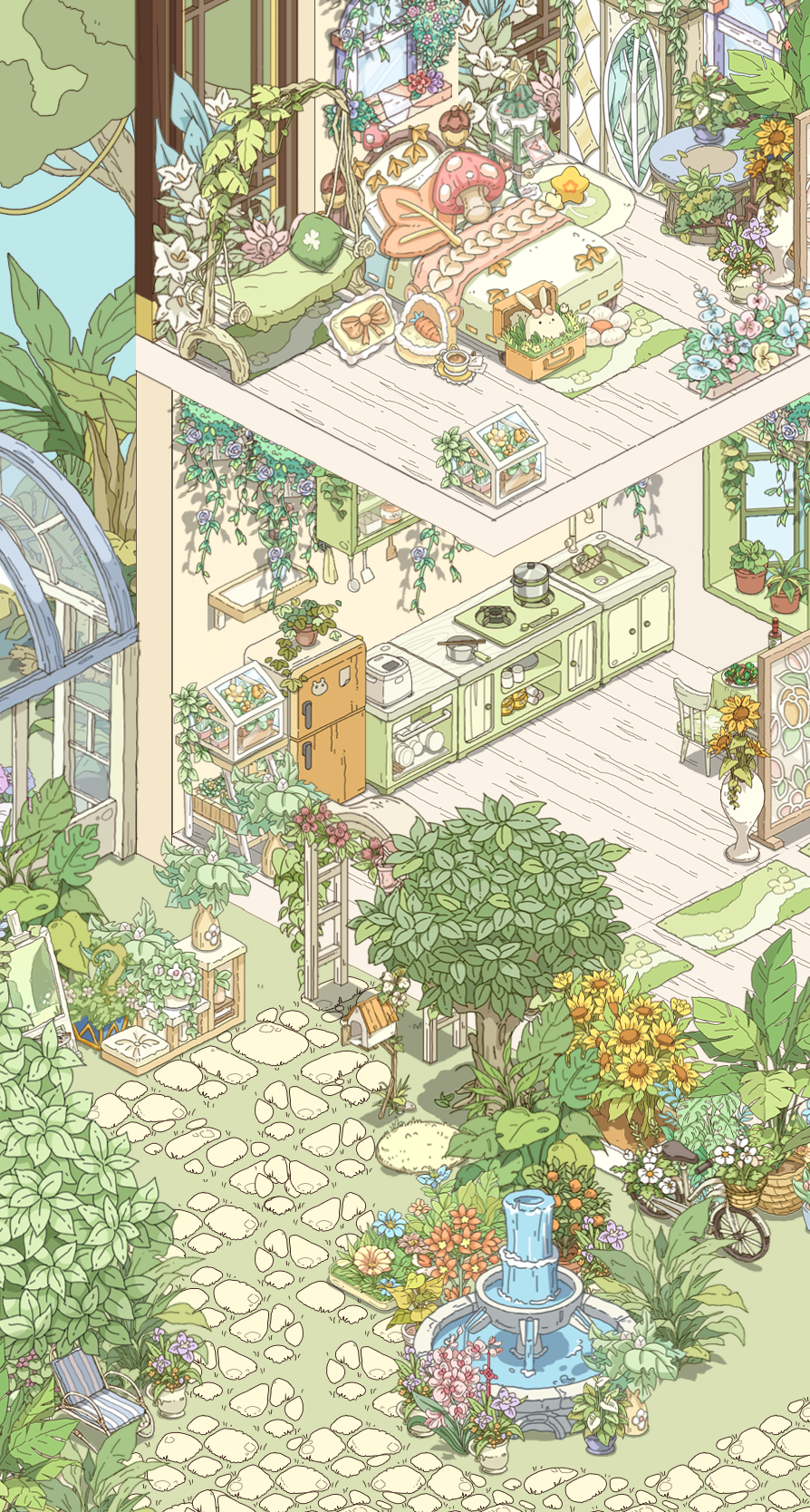 我就喜欢这种绿绿葱葱,被植物包裹的感觉,美死了,本来我想搞成彩色的植物,但奈何家具太少了,其实我想分享两个家园的,但是分享码一个户型一天只能分享一次,这点我希望能改进一下,顺便问一下,。房子谁知道如何隐藏房子,我想看内饰