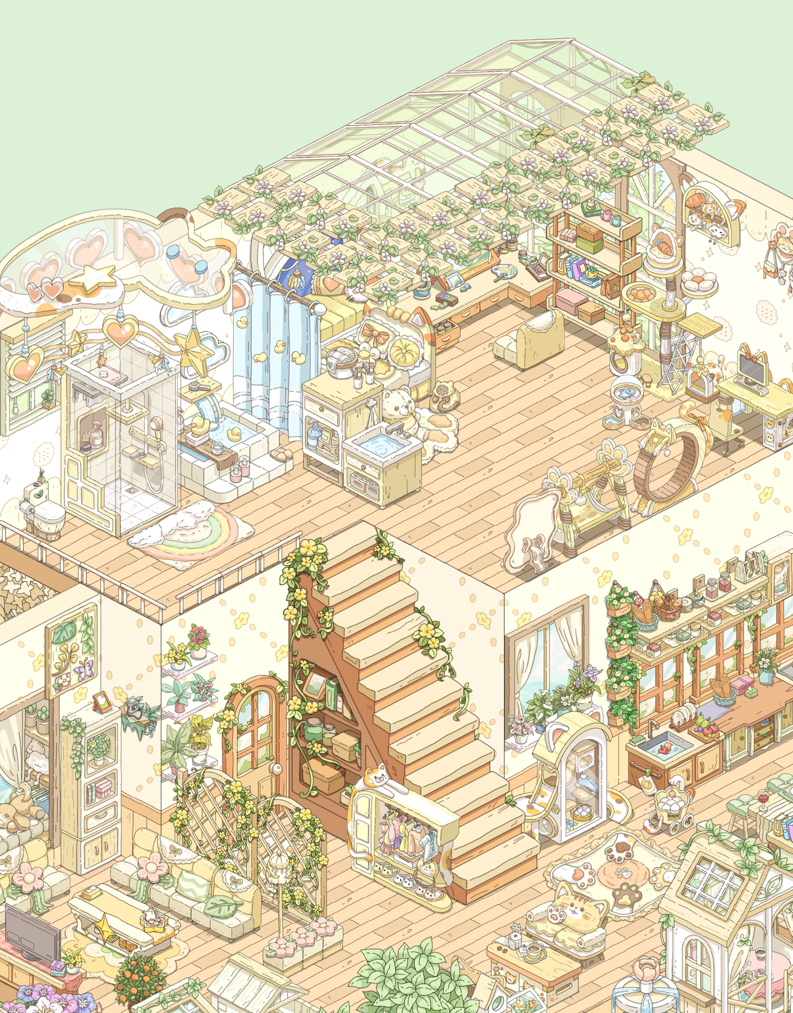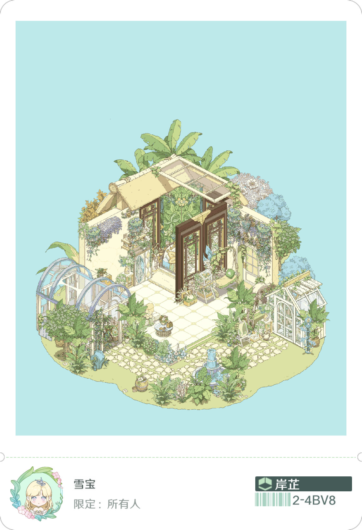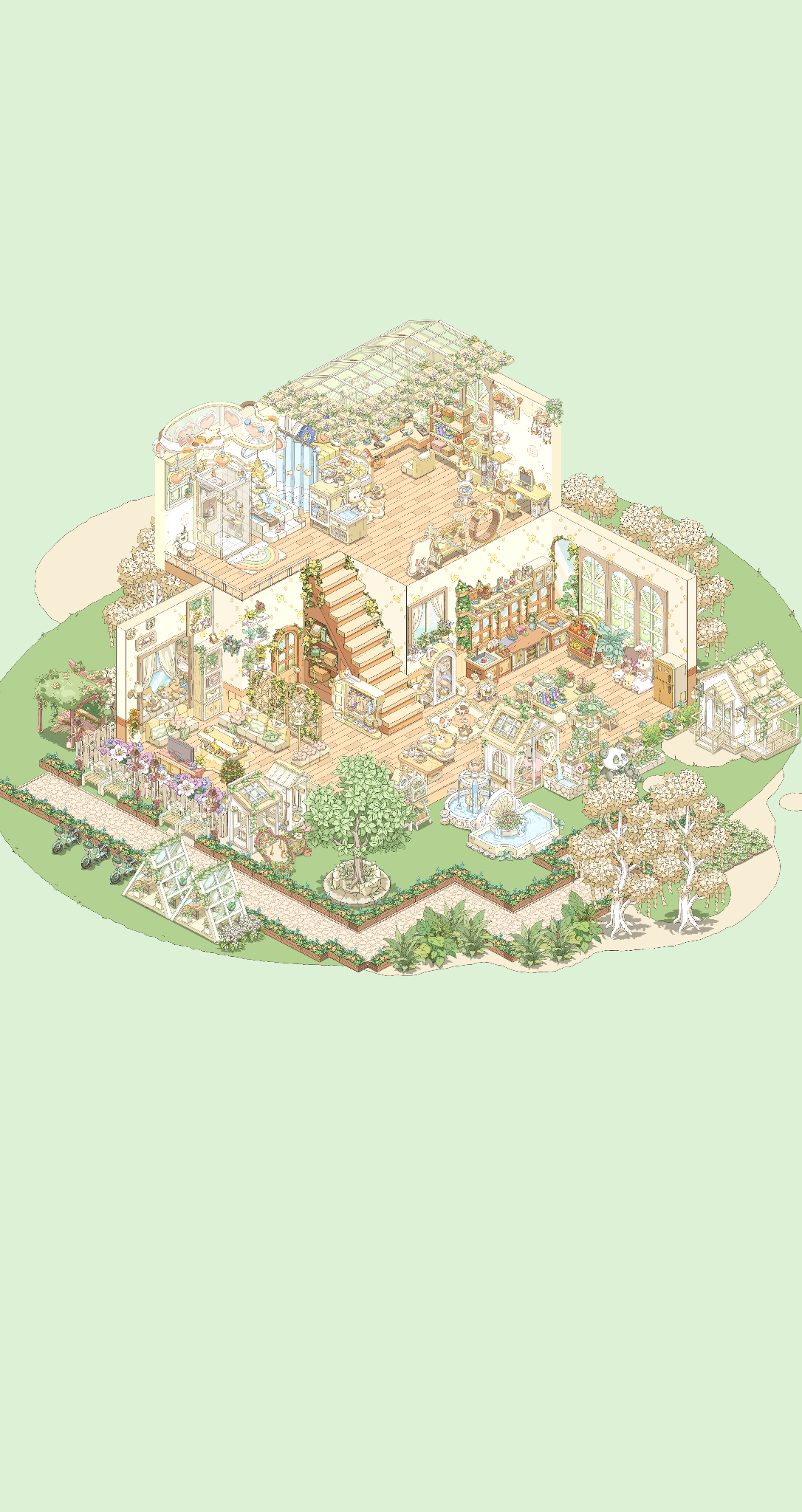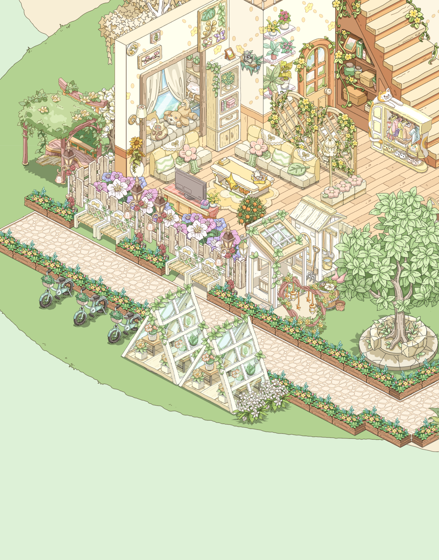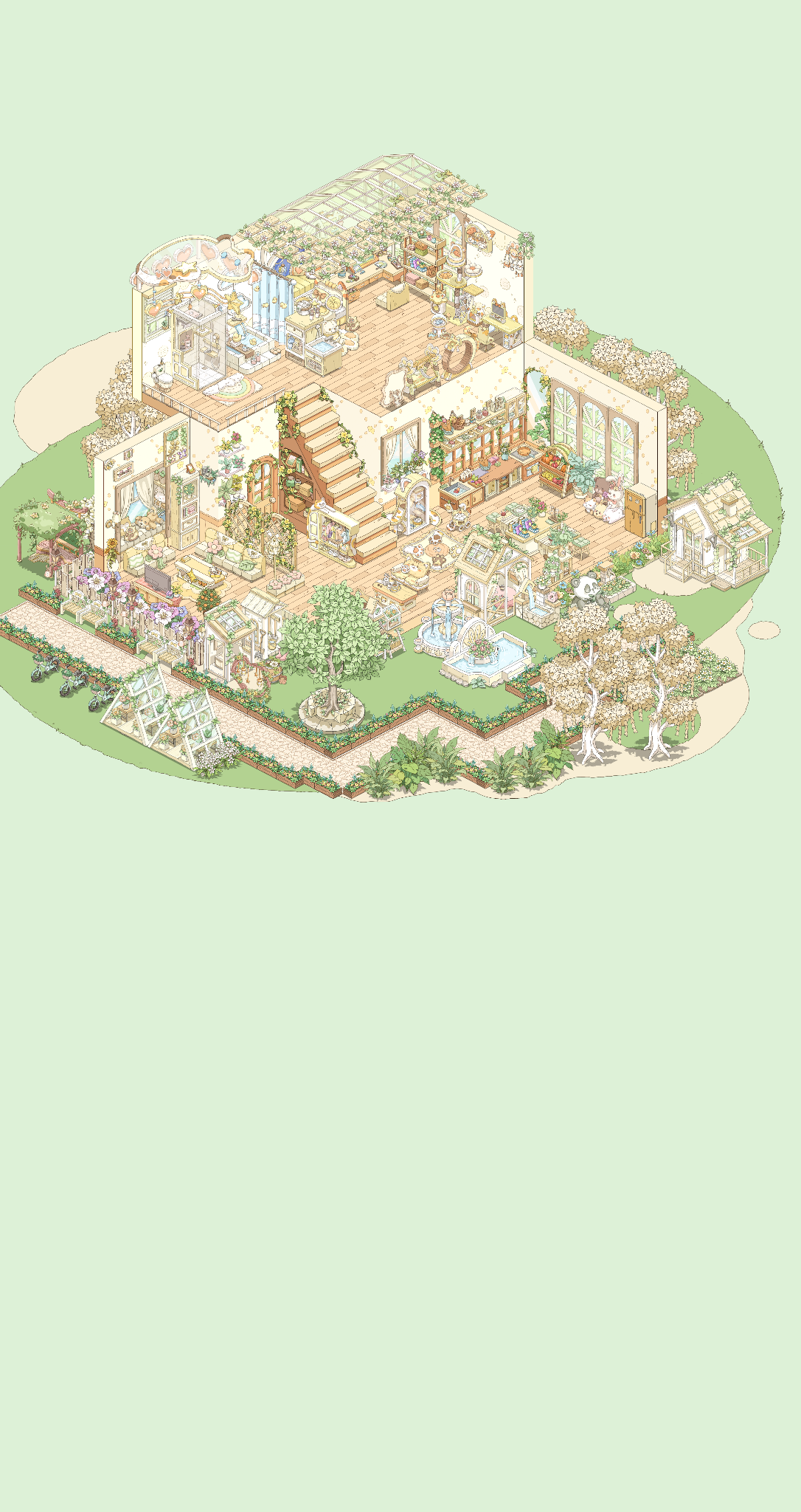 我就喜欢这种绿绿葱葱,被植物包裹的感觉,美死了,本来我想搞成彩色的植物,但奈何家具太少了,其实我想分享两个家园的,但是分享码一个户型一天只能分享一次,这点我希望能改进一下,顺便问一下,。房子谁知道如何隐藏房子,我想看内饰