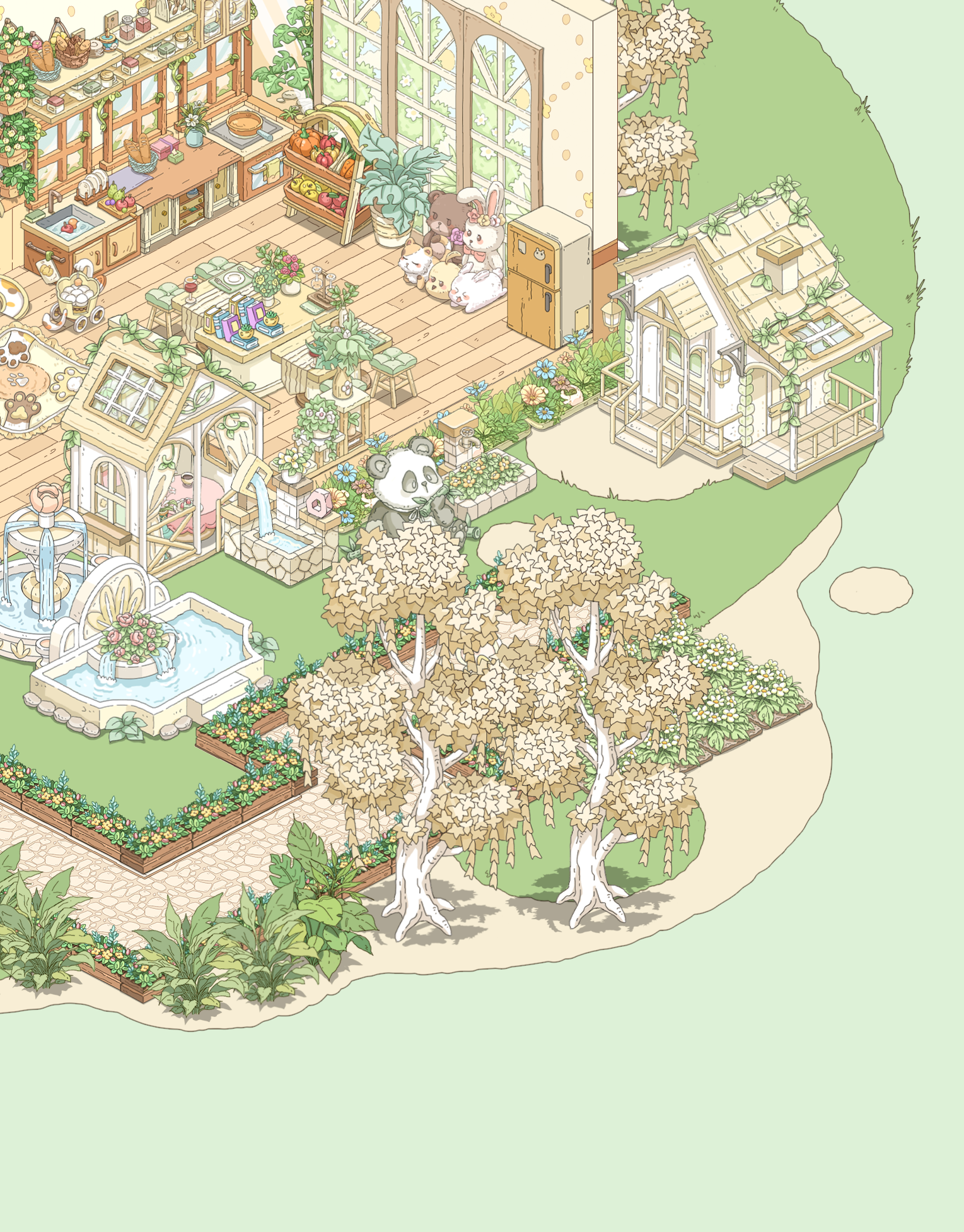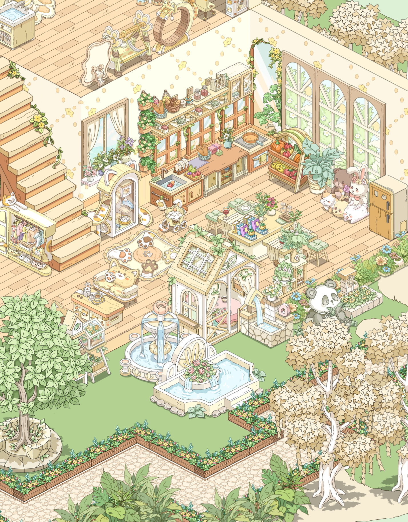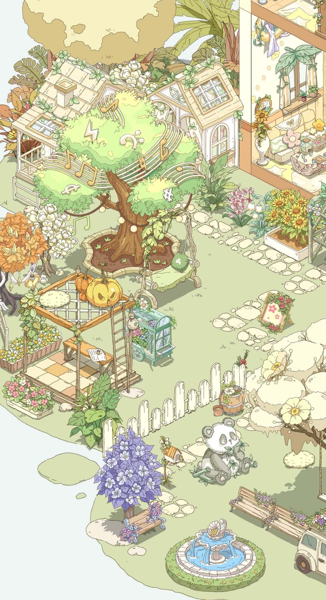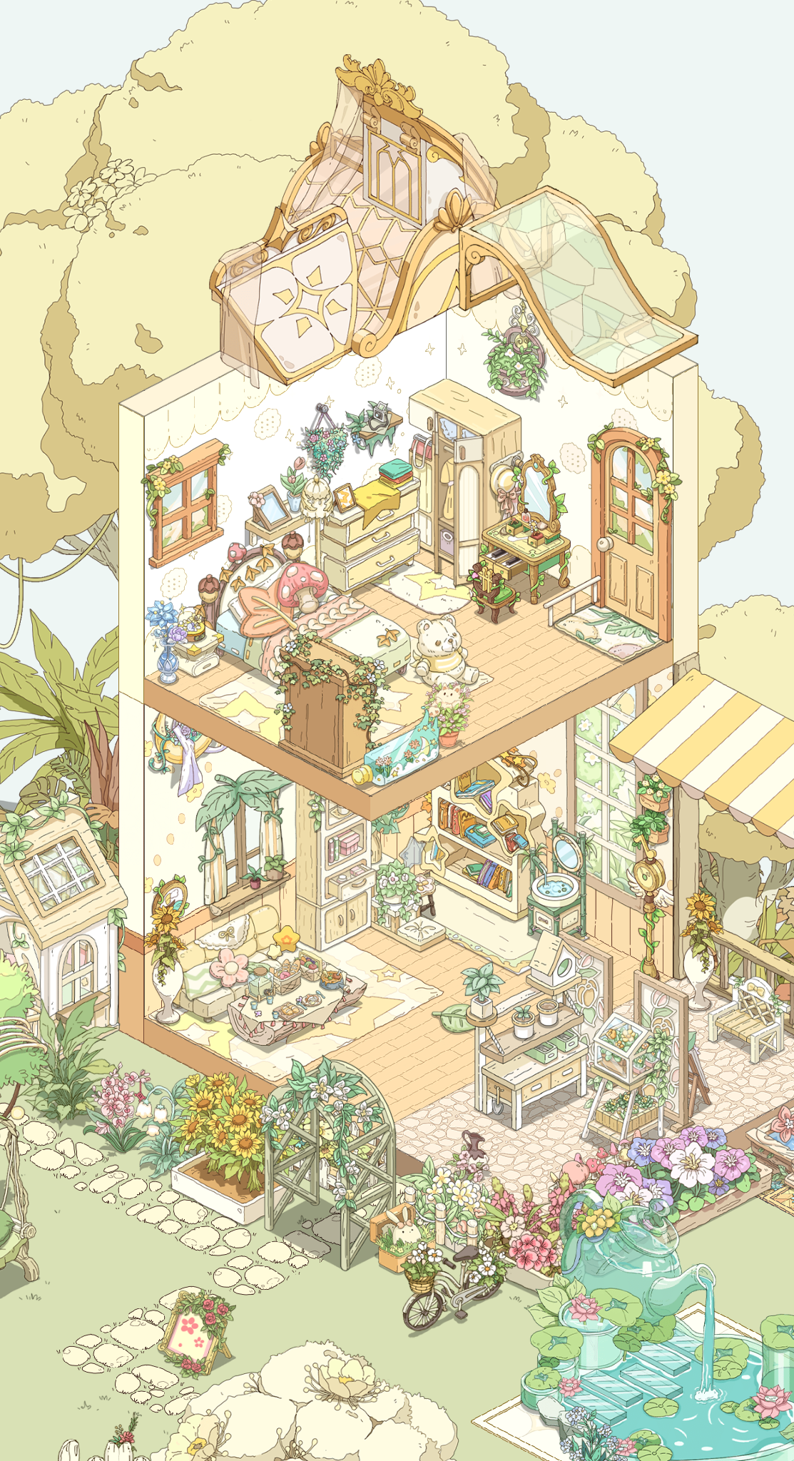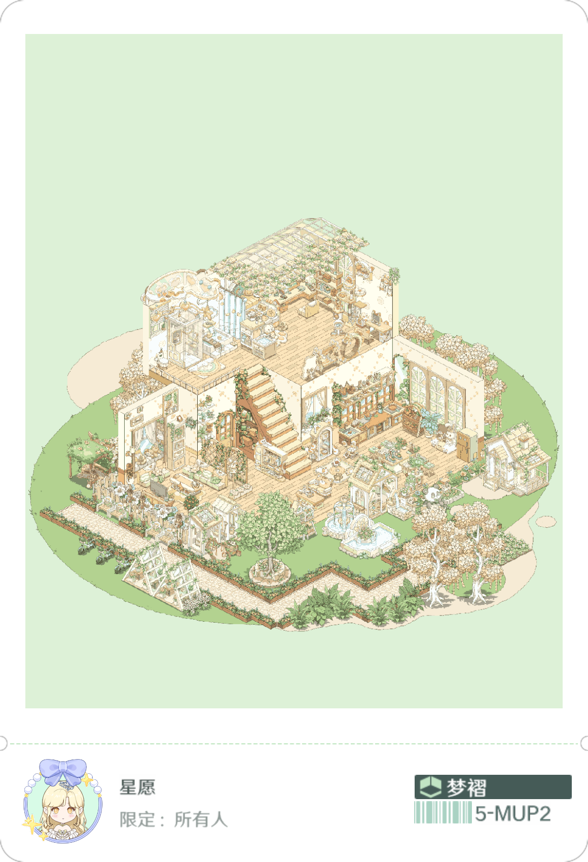 我就喜欢这种绿绿葱葱,被植物包裹的感觉,美死了,本来我想搞成彩色的植物,但奈何家具太少了,其实我想分享两个家园的,但是分享码一个户型一天只能分享一次,这点我希望能改进一下,顺便问一下,。房子谁知道如何隐藏房子,我想看内饰