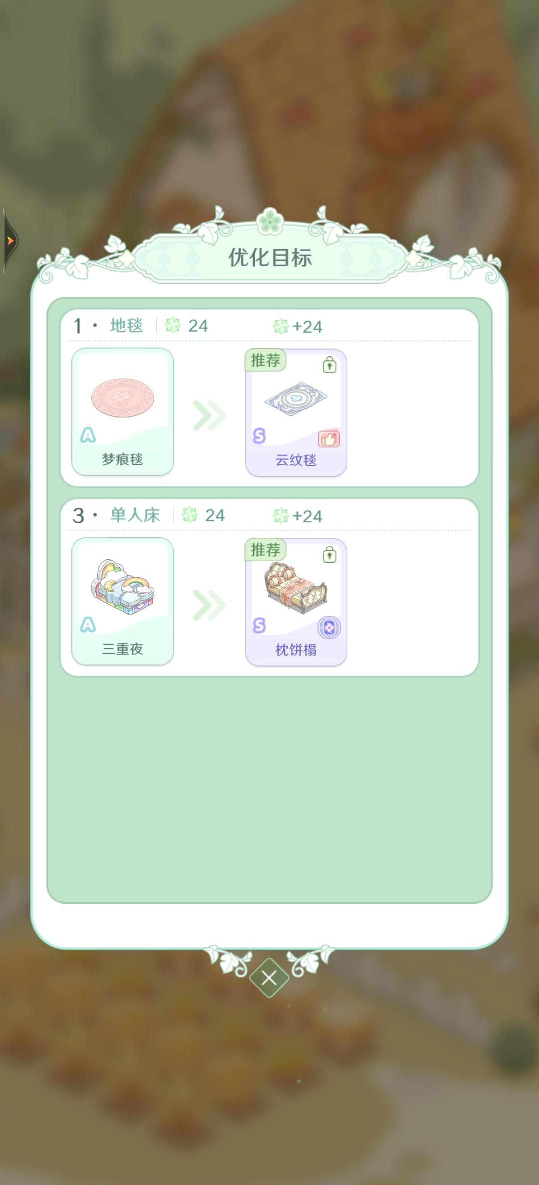 玩了这几天下来我的感受:①紫币完全不够用,十级往后开始慢慢就会卡关,只能停下来做小物订单凑②绮梦关卡大部分需要A级往上的物品,要不然凑满三星真的太难了,有的关卡必须优化到S级或者SR级才能到三星,而S级及更高等级的商品越贵,解锁需要的紫币或者好评就越多,这也导致了货币超级紧凑完全不够用。③完成绮梦给的奖励太少了,跟付出完全不成正比④花语图鉴的升级都是零零散散的,希望官方可以将可以升级的统一
