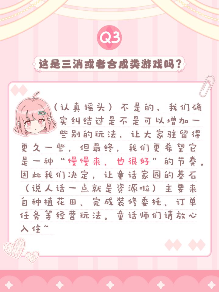 亲爱的各位童话师,你们好呀~最近收到很多留言和提问,我们把大家最关心的几个问题整理成一段小答疑,用更清晰的方式,把我们的“绮梦乡”先讲给你听——关于游戏的类型、家园户型的特色、核心玩法、开发进度,具体内容滑动查看图片文字哦~最后,如果要说对这个游戏最大的想象,我们希望它能成为你我手机里的一个小角落——累了、烦了的时候,打开就能找回一点温柔的松弛感。我们在绮梦乡等你,一起把童话的扉页,轻轻