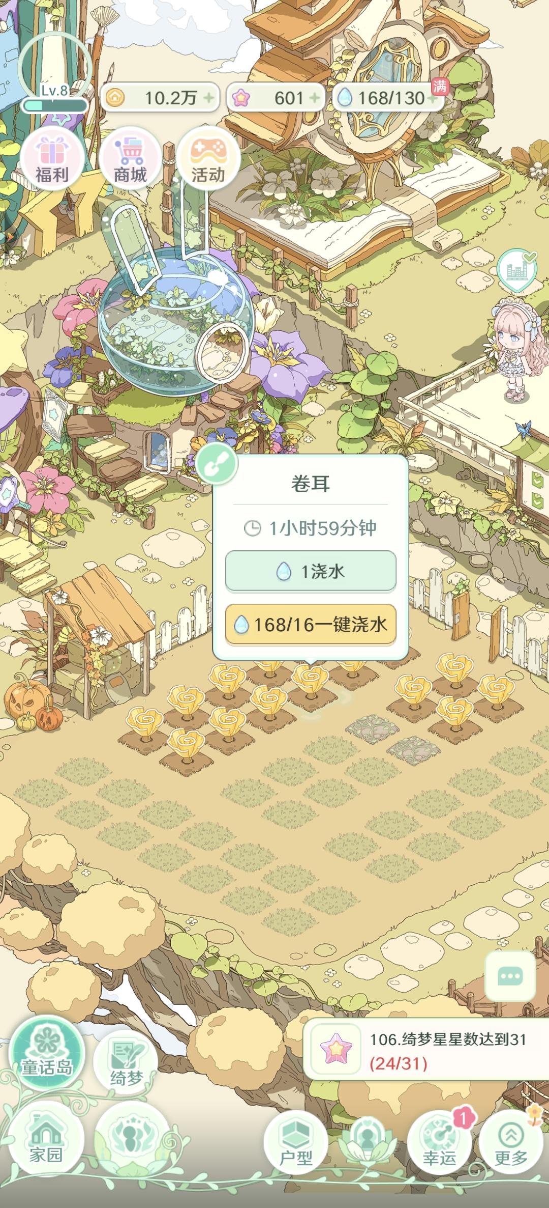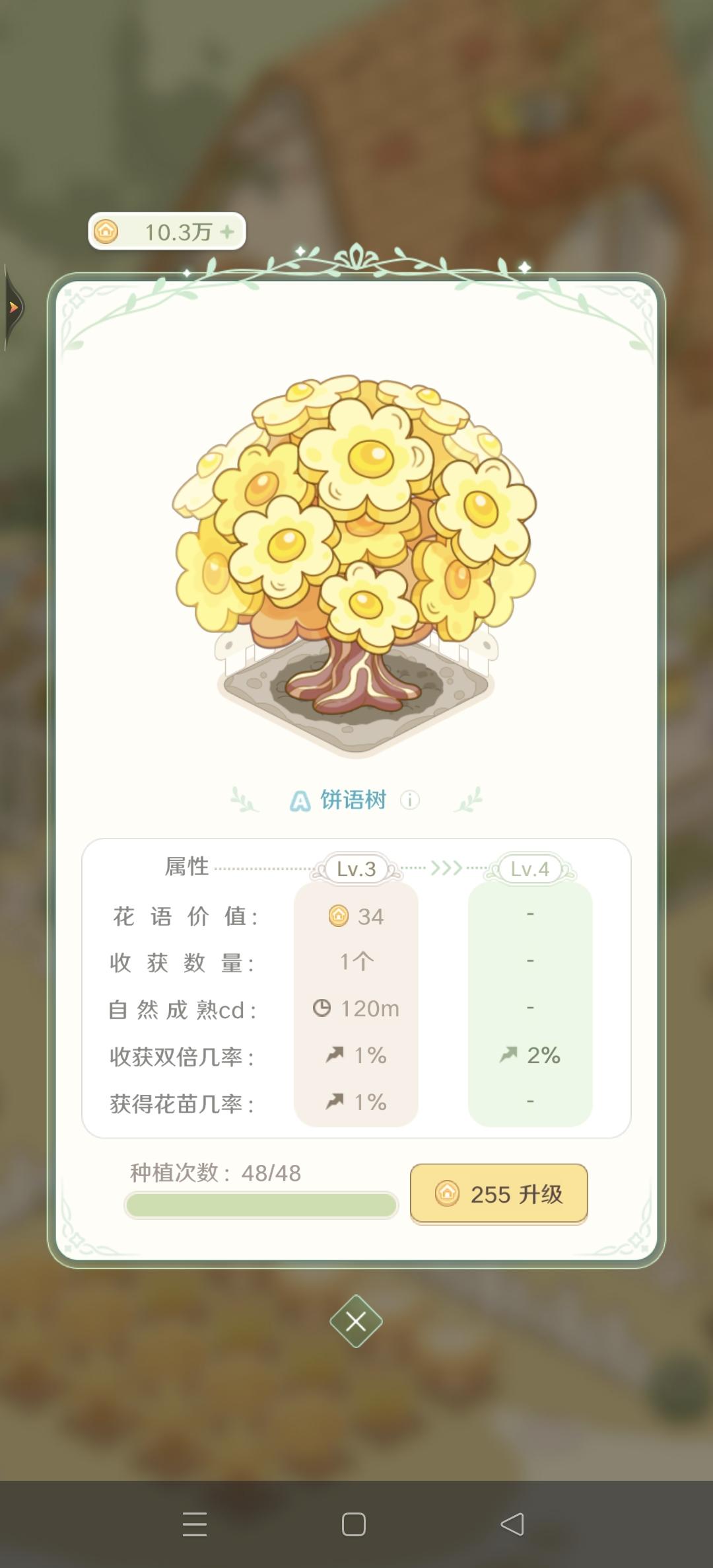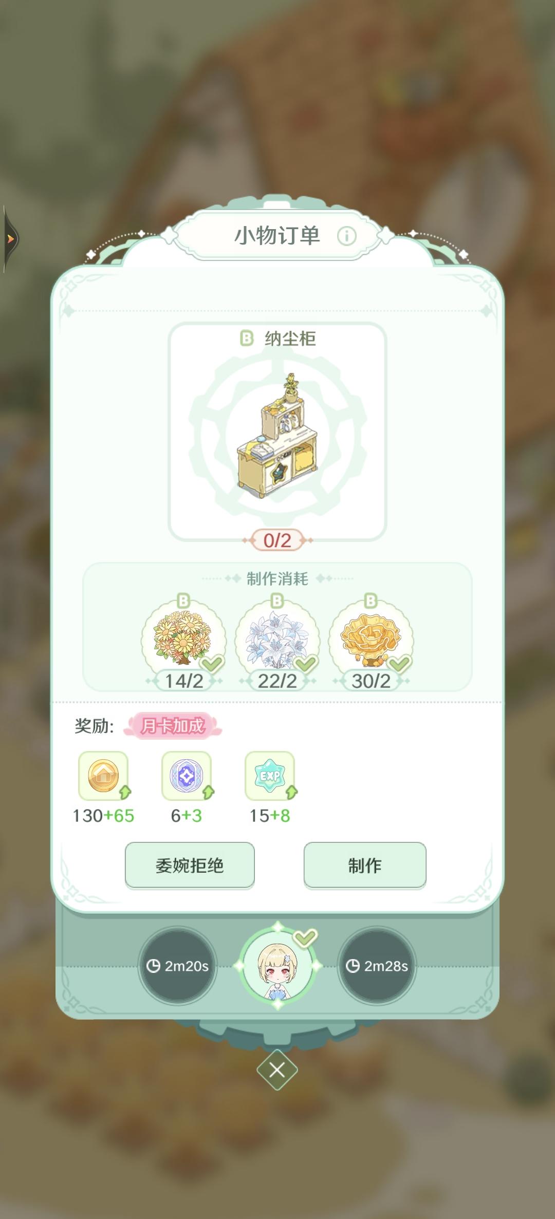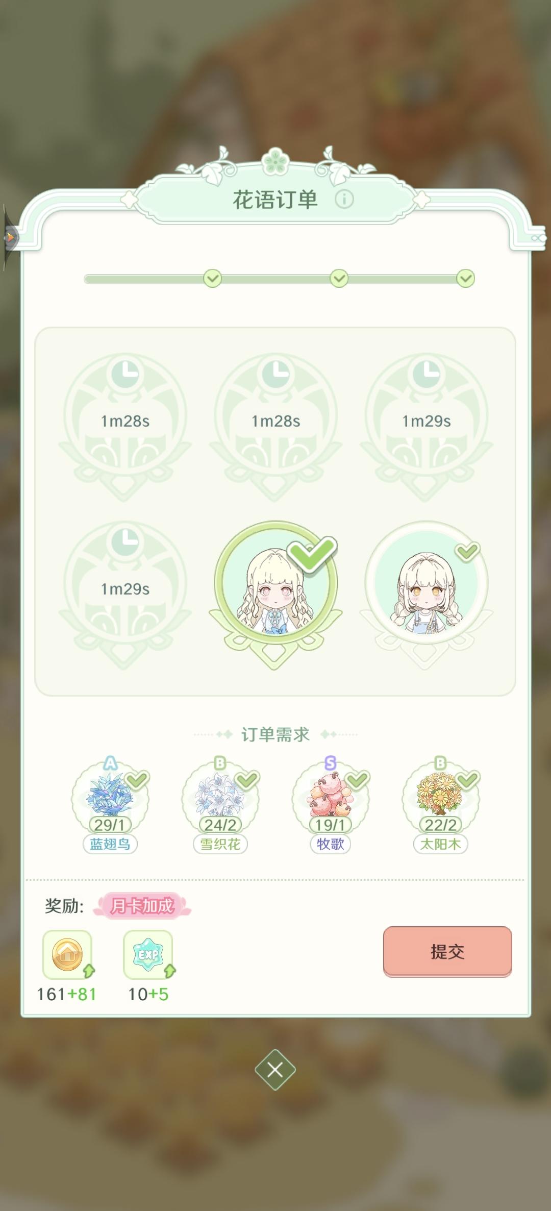 第一个就是种花CD时间过长,需要两个小时(图一)而提交的订单需要花材图二,这就有点矛盾了,可能想要卡级吧,而且玩了半个多小时一直在种花,把花升级了,发现是卖出去的价格更高了,且能收获的还是一颗我觉得这里可以改进一下,不然一直都是种花还耗费时间。也有可能是在后面升级了才有,但前期就很缺了,不改改玩不下去了,各种地方都要花,但如果没有一键没有水滴就得等那么久,订单cd也有点长,一分半、两分半的,不知道