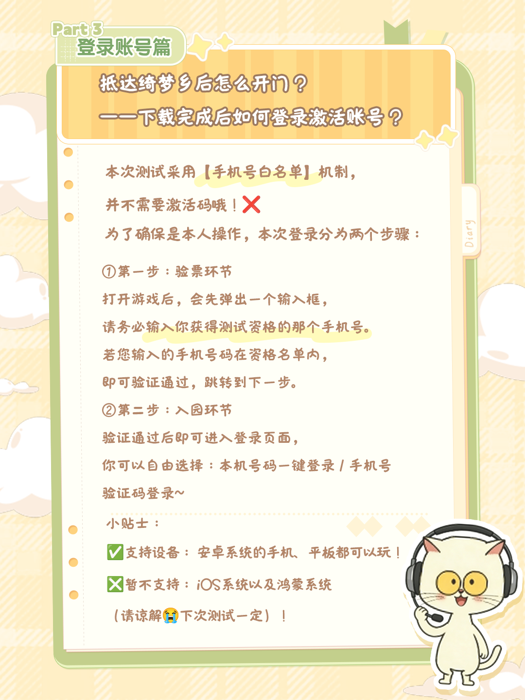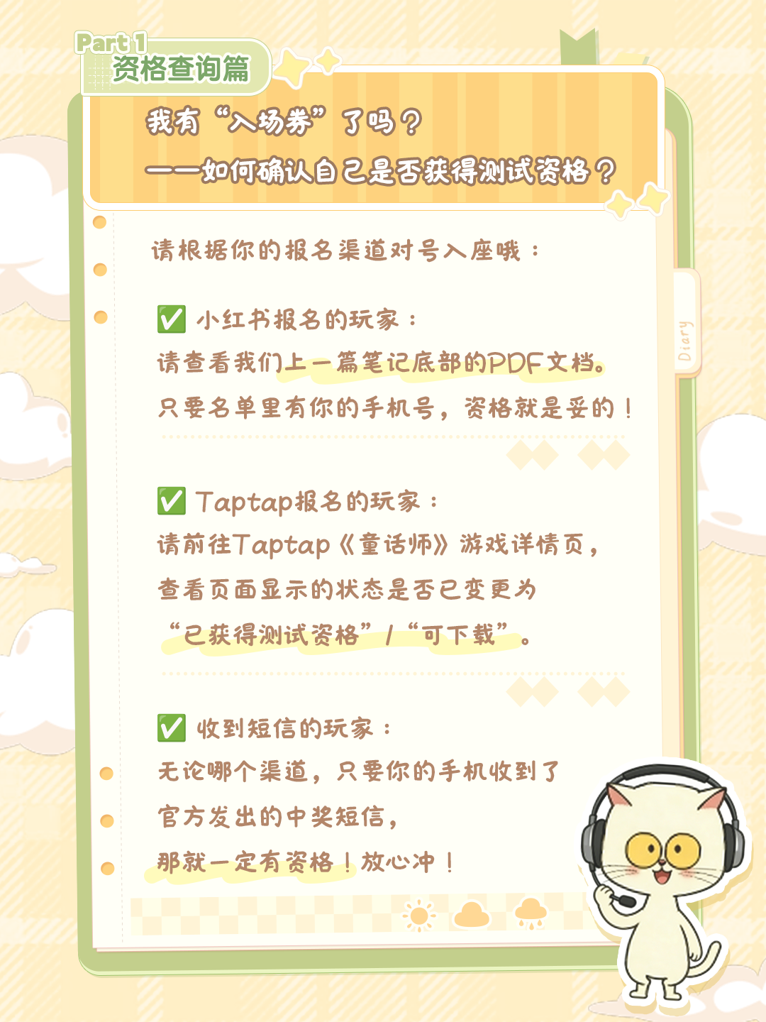后台收到好多私信问资格怎么查?去哪下载?别急别急!制作组连夜整理了这份【超全入园指南】,建议先收藏再看,明天一定用得上!👇Part 1:资格查询篇我有“入场券”了吗?——如何确认自己是否获得测试资格?请前往Taptap《童话师》游戏详情页,查看页面显示的状态是否已变更为“已获得测试资格”/“可下载”;或查看您的手机是否收到了官方发出的中奖短信,或通过下表查阅您的手机号是否出现在测试名单中h