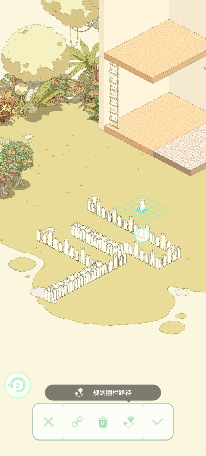 16:02编辑内容(超字数了,删了一些不重要的内容):升到8级就可以自己装修房子了,先总结——瑕不掩瑜,我很满意。虽然只能按住圆圈⭕的地方才能移动物品,但是❗他有两个很好用的功能:链接🔗和规划路径。简单来说,链接就是把围栏连成一个整体,移动删除的时候就不用一个一个部件去动了;规划路径就更好用了,如图,栅栏形状可以根据你画的路径安置,真的太太太好用了,建议大家多摸索一下,我感觉肯定还有惊喜。是10