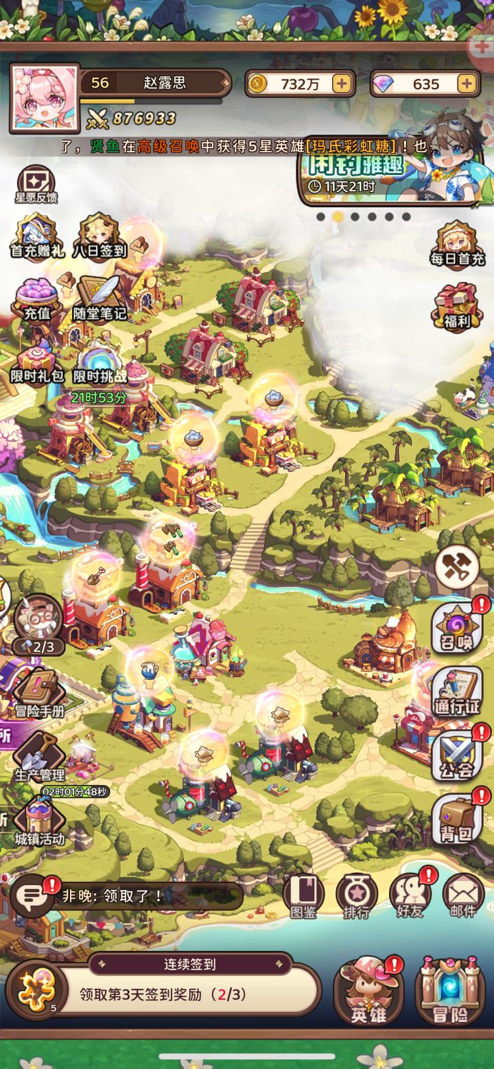 主要玩法⭐⭐⭐⭐:玩家通过建造属于自己的糖果小镇获取物资,一步步壮大自己的王国,并通过交易升级来提高战力,争取排名