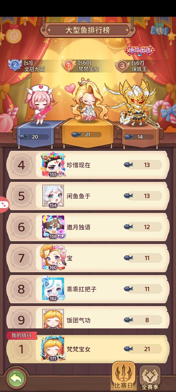 目前巅峰对决已经能拿下跨服第一,战力虽然和第一差了1200w但越战胜率接近100%。今天第70天,没啥活动,策划是怎么做到这么阴间的全服共享的钓鱼活动的,鸡肋至极。本来是要挑战百日上亿的,再没有冬日暖阳这种活动肯定没戏了,甚至星落奇境都没有第二个赛季,这挺麻烦的,相当于专属魔导器没法提升了。白嫖魔导器那真的是100天才能搞好一个角色~。