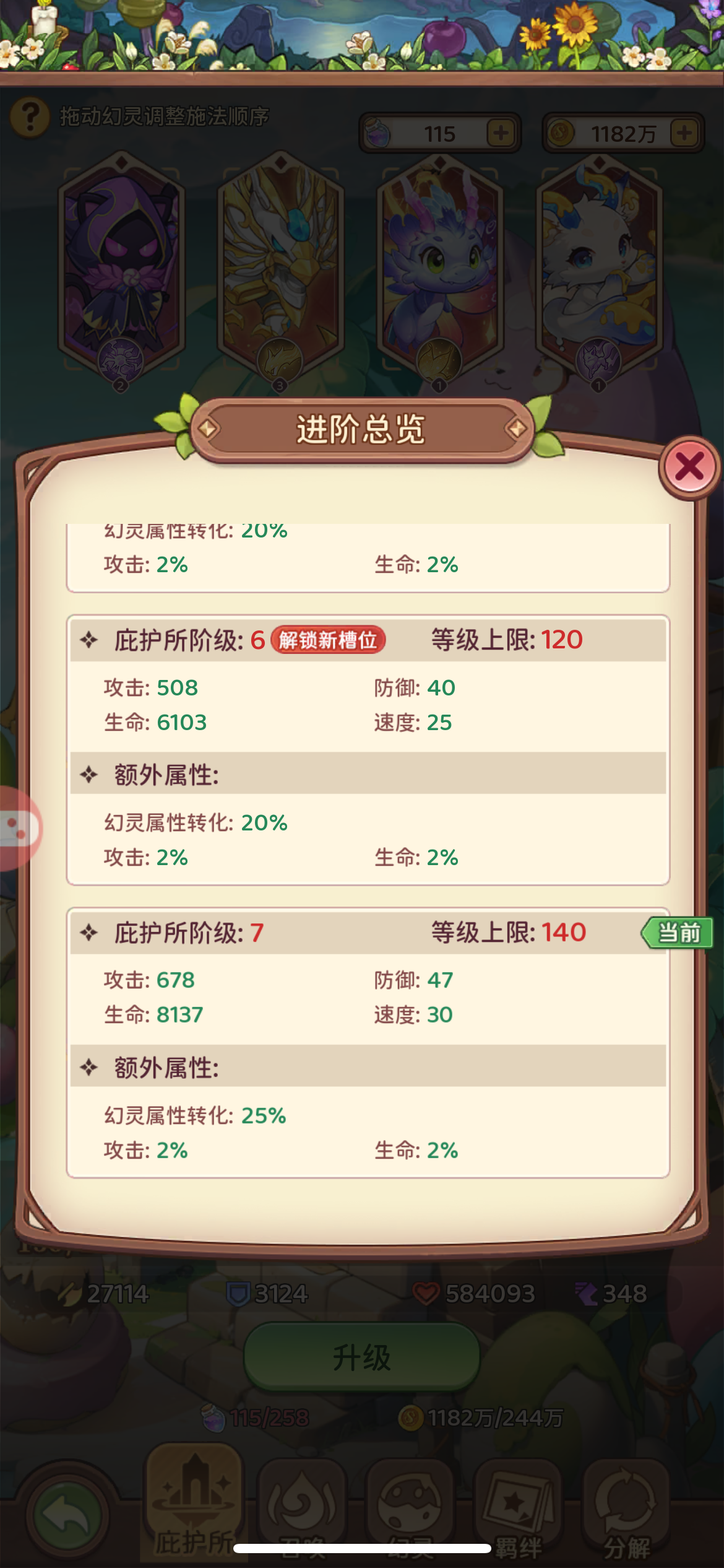 最近看很多人有个误区,就是紫色橙色的幻灵碎片全部分解来提升庇护所等级,这样做到底值不值。我的回答是:在121级前这种做法都是正收益为什么?首先我们要搞懂幻灵庇护所的数值怎么来的,就是你所有幻灵数值总和×幻灵转化率而121级就刚好是一个期望收益率最高的等级,往下降有数值但缺转化率,往上升有转化率但是没数值,并且还不谈需要更多精华的问题所以到达121级后我们就可以回头给橙色幻灵升星了(紫色依