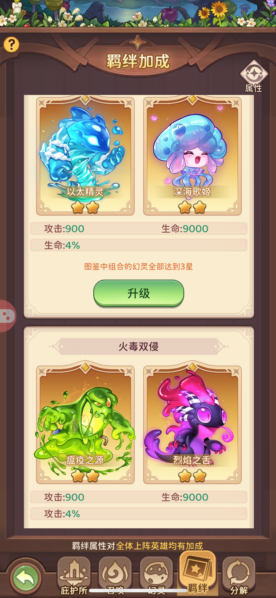 以当前幻灵图鉴来分析当前幻灵该如何培养首先看紫色幻灵,它的效果图,它的升星效果都是数值增加,而且成长很低,所以个人认为紫色幻灵不升星,开完图鉴就可以了,多余碎片分解升庇护所等级我们再来看看橙色幻灵,橙色幻灵升到3星就有新的效果了,但是橙色幻灵应该是最早被淘汰的,而且幻灵的培养的速度也不快,所以个人觉得选一个橙色幻灵比较优秀的集中培养然后我们来看看四个橙色幻灵的效果以太精灵:打3,概率减速降
